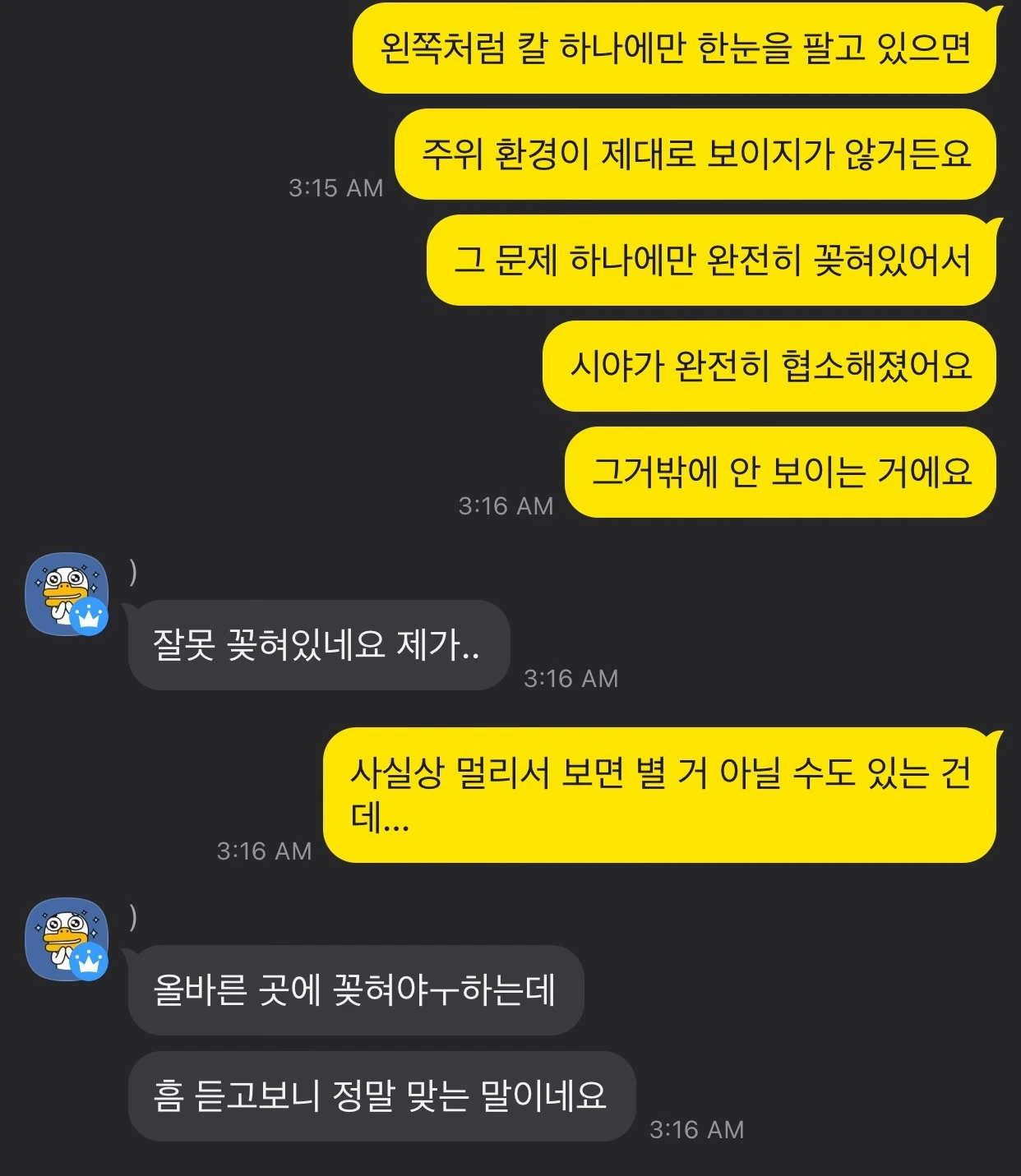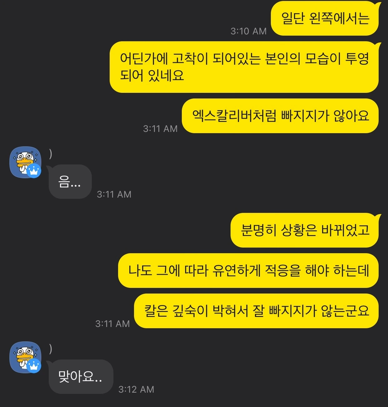 “분명히 상황은 바뀌었고, 나도 그에 따라 유연하게 적응을 해야 하는데, 칼은 깊숙이 박혀서 잘 빠지지가 않는군요. 왼쪽처럼 칼 하나에만 한눈을 팔고 있으면 주위 환경이 제대로 보이지가 않거든요. 그 문제 하나에만 완전히 꽂혀있어서 시야가 완전히 협소해졌어요. 그거밖에 안 보이는 거에요. 사실상 멀리서 보면 별 거 아닐 수도 있는 건데…”