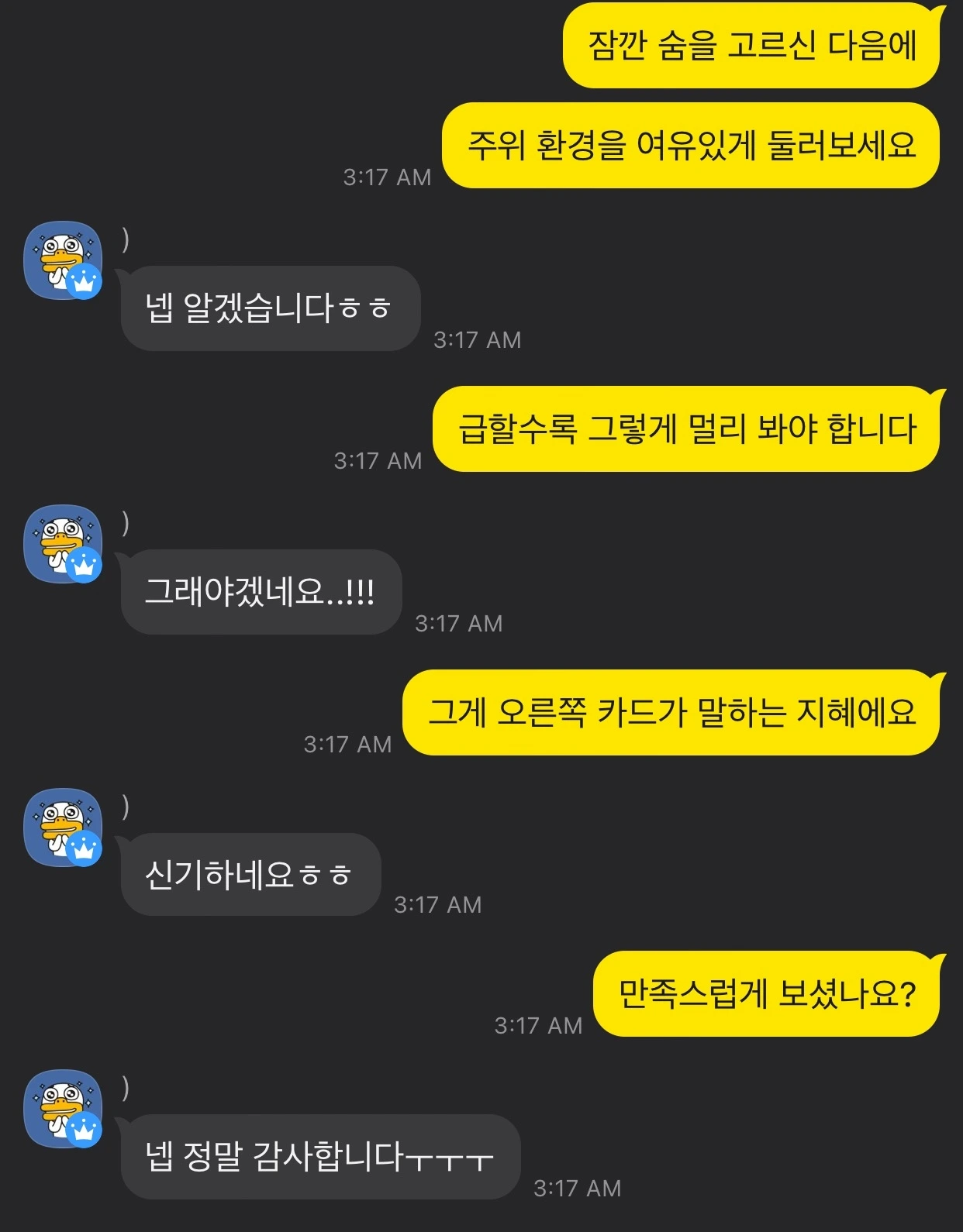 “잠깐 숨을 고르신 다음에 주위 환경을 여유있게 둘러보세요. 급할수록 그렇게 멀리 봐야 합니다. 그게 오른쪽 카드가 말하는 지혜에요.”