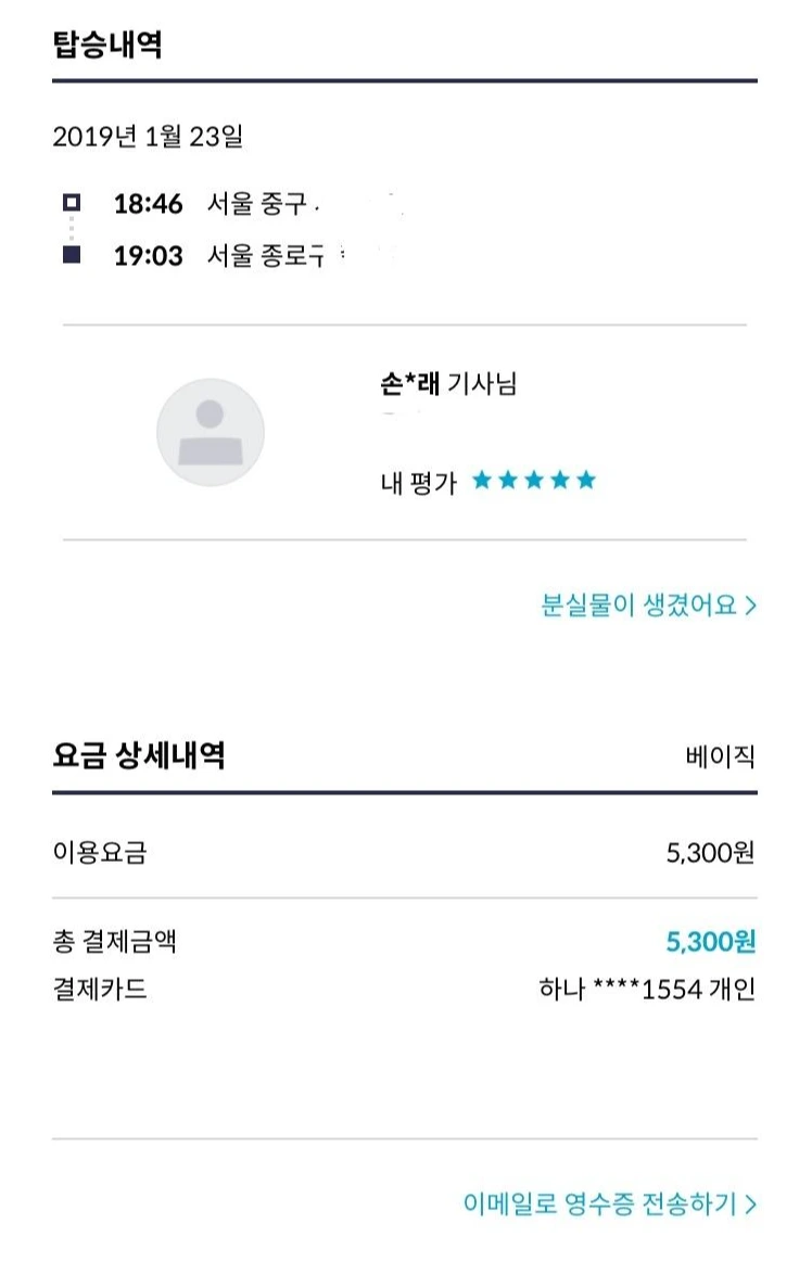 타다의 영수증, 즉 지출 증빙에 대한 UX가 마음에 든다. 야근할 때, 회식 이동 시에 타다를 자주 이용했던 경험상 지출 증빙을 해야한다.(물론 법인 카드 사용시에는 번거로운 절차가 줄어들어 어느 어플을 이용하더라도 차이를 못느낄 수 있다.) 나의 경우에는 법인카드가 없기에(회사 내 레벨 zero에 수렴...ㅠㅠ) 종이 영수증을 챙겨야 한다거나 어플리케이션 내에서 영수증 발급에 대한 절차(Depth라고 해야할까?)가 번거롭다면 다음번 사용때에는 사용을 조금 꺼리게 된다. 타다는 '탑승내역 - 해당 사용 내역 클릭 - 이메일로 영수증 전송하기' 3단계이면 지출 증빙을 위한 영수증이 발급된다. 그리고 막상 직면하면 당혹스러운 분실물 문제도 비교적 자세하고 편리한 프로세스로 해결할 수 있다는 점이 좋다. 탑승 3시간 이내에 분실했다는 것을 발견하면 해당 드라이버와 다이렉트로 전화 통화를 할 수 있으며(단 습득시 드라이버 이동을 위한 영업 손실비 2만원 부과), 하차 3시간 후에는 문의하기를 통해서 고객 센터를 통해 해결할 수 있다.(착불 택배 배송 또는 드라이버 통해 물품 수령(이것 역시 2만원이 부과된다))