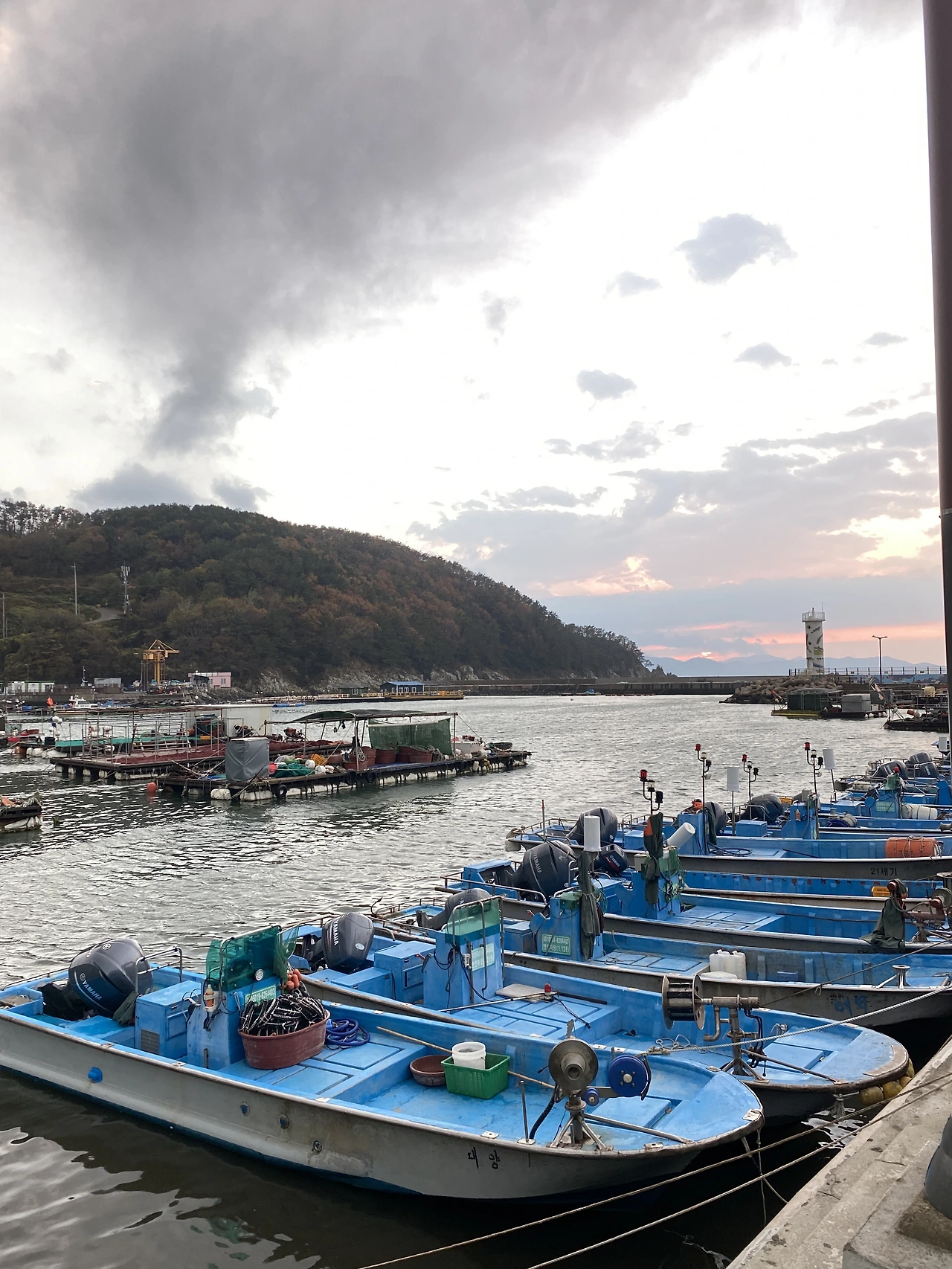 대항은 가덕도에서도 남쪽 거의 끝자락에 위치한 곳이라 낚시꾼들 이외에는 외지인들이 찾지 않는 곳이라고 한다. 내가 갔을 때에도 현지인들만 (그것도 간혹) 만날 수 있었고, 낚싯대를 들고 차에서 내리는 사람들만 가끔 있었다. 해질 무렵 도착해 바라본 대항의 바닷가는 비 온 뒤의 고요함만큼이나 평화로웠다. 항구의 만(灣) 앞에 T자 형태로 지어진 방파제와 그 양 끝에 위치한 등대가 그 정취를 더했다. 작은 어촌 마을답게 큰 배는 찾기 어렵고 작은 어선들이 항구에 정겹게 매달려 있다. 내가 좋아하는 소소한 풍경이다.