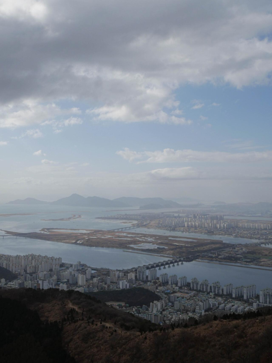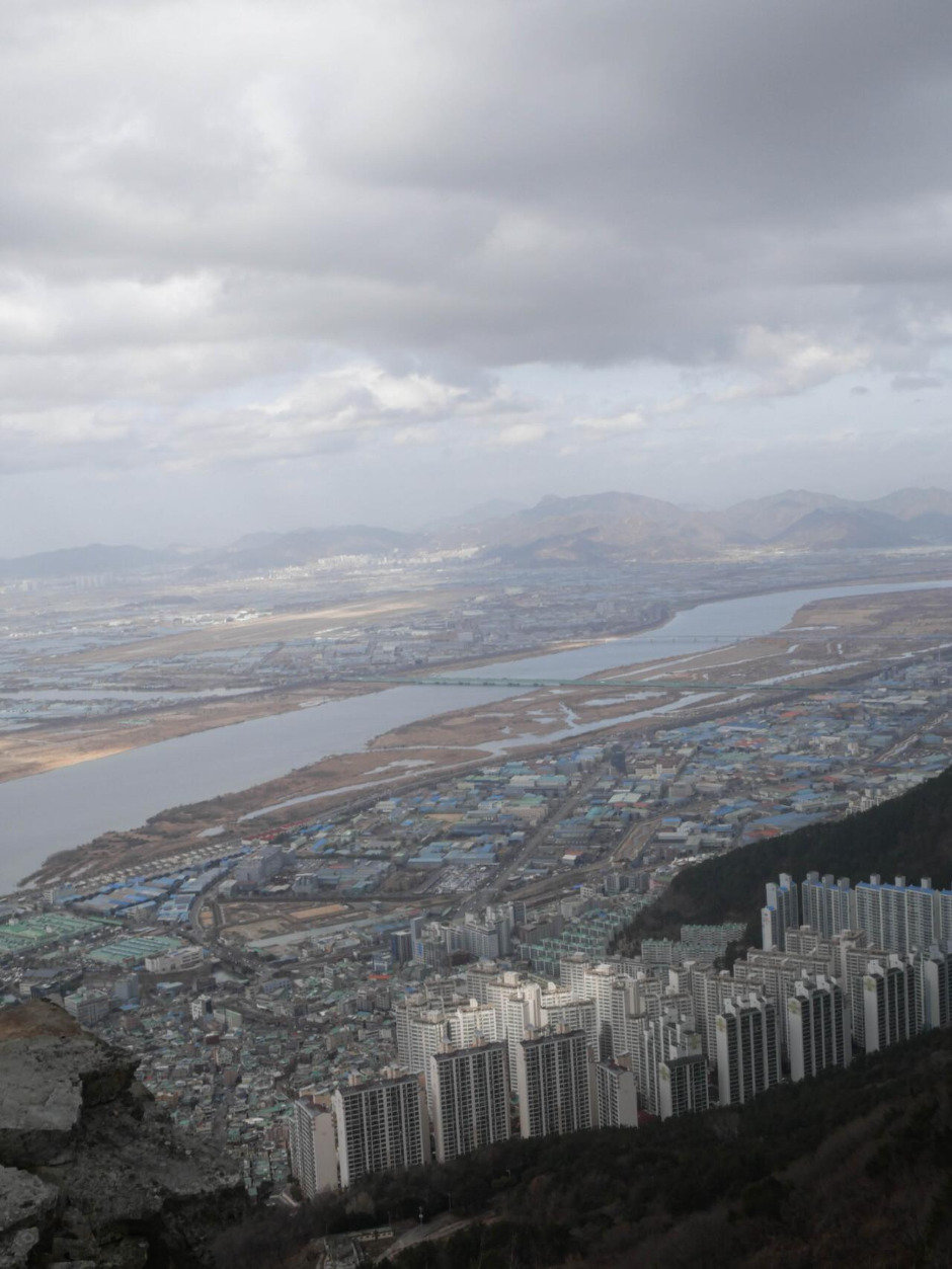서서히 건물들이 멀리 보이기 시작하고, 바람의 온도가 차가워지기 시작한다. 포장도로가 끝나는 시점이 되자 눈앞에 억새평원이 펼쳐진다. 승학산은 가을에 이곳 억새를 보러 사람들이 많이 찾는 산이라고 한다. 탁 트인 전망을 보니 '그래. 이 맛에 고생을 해도 등산을 하지'하는 생각이 들었다. 남쪽으로부터 동쪽까지 보이는 광경은 멀리 영도부터 남포동 일대, 하단을 거쳐 을숙도와 강서구 명지동 일대까지, 부산의 구도심 지역을 한눈에 볼 수 있다. 특히 '부산현대미술관' 관람 덕에 요즘 자주 들리고 있는 을숙도 전체를 위에서 내려다보는 경험은 색달랐다. 빽빽하게 들어선 아파트로 채워진 대륙과는 달리, 몇 채의 건물만 있고 녹지가 아직 그대로 남겨져 있는 섬의 모습이 낯설다. 을숙도는 현재 특별 보존지역으로 남쪽의 지역 대부분은 사람들의 출입이 금지되어 있다고 한다. 철새들이 한 계절을 쉬었다 갈 수 있도록 배려한 것이다.