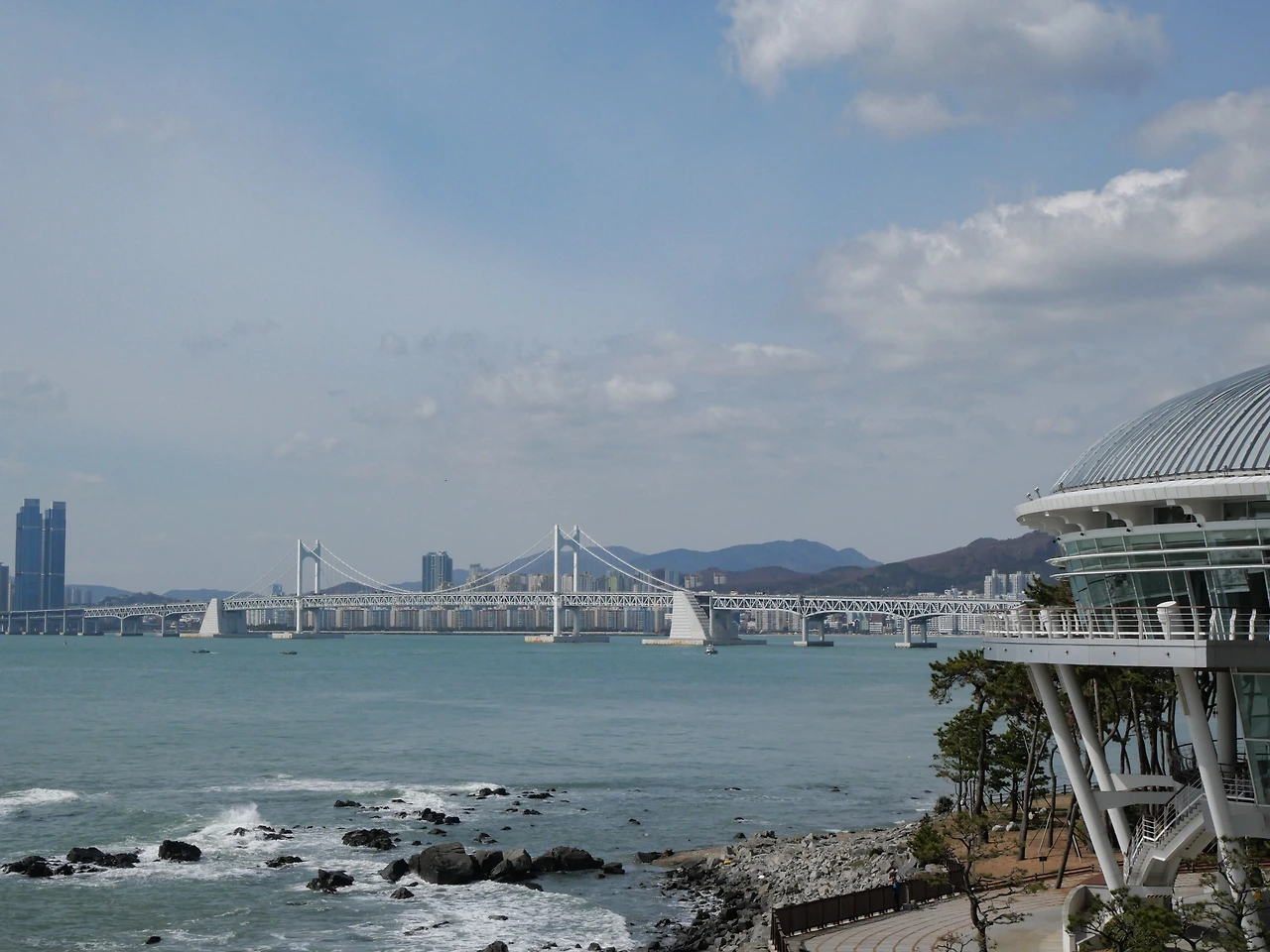 산책로를 따라 오르막을 잠깐 올라가다 보면, 2005년 APEC 정상회담이 열렸던 장소인 '누리마루'가 눈에 들어온다. 내부에서 통유리창을 통해 바다가 바로 보이는 풍경에 눈이 즐겁다. 내려가는 계단을 통해 누리마루 앞 광장으로 나오면 파도 소리가 가까이 들리는 바다를 바로 앞에서 볼 수 있다. 바다를 기준으로 오른쪽으로는 광안대교가, 왼쪽으로는 해운대 신시가지가 보인다. 사실 동백섬 자체는 면적이 그리 크지 않아 금방 둘러볼 수 있는 곳이기에 해운대와 같이 묶어서 글을 쓸까 생각도 했지만, 부산에서도 가장 이국적인 동네인 해운대와 동백섬은 분위기가 매우 다른 곳이기에 별도로 글을 쓰기로 했다.