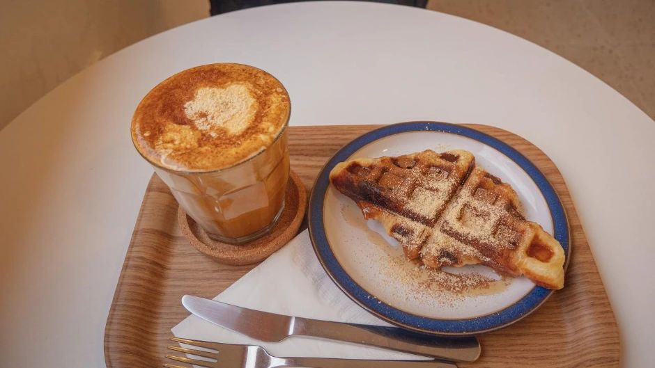 무진정으로 들어왔던 길과 반대편 길로 내려가면 근처의 카페와 식당들이 나옵니다. 점심시간이었지만 배는 그렇게 고픈 편이 아니었기에, 잠시 쉴 겸 카페에 들렀습니다. 무진정 호수가 통창으로 보이는 카페도 있었지만 이미 많은 사람들이 있더라고요. 바로 옆 가게인 '카페 식목일'로 선택했습니다. '식목일'의 초성을 따서 만든 '△□●'의 로고가 최근 전 세계적으로 대유행을 했던 K-드라마 '오징어 게임'을 연상시키더라고요. 시그니처 메뉴인 '식목일 라떼'와 '메이플 크로플'을 주문했습니다. 음료의 비주얼이나 맛, 내부 인테리어도 456억 정도의 가치를 한달까요. 특히 제가 앉았던 자리에서 창으로 보이는 가을 나무의 모습이 매우 예뻤어요.