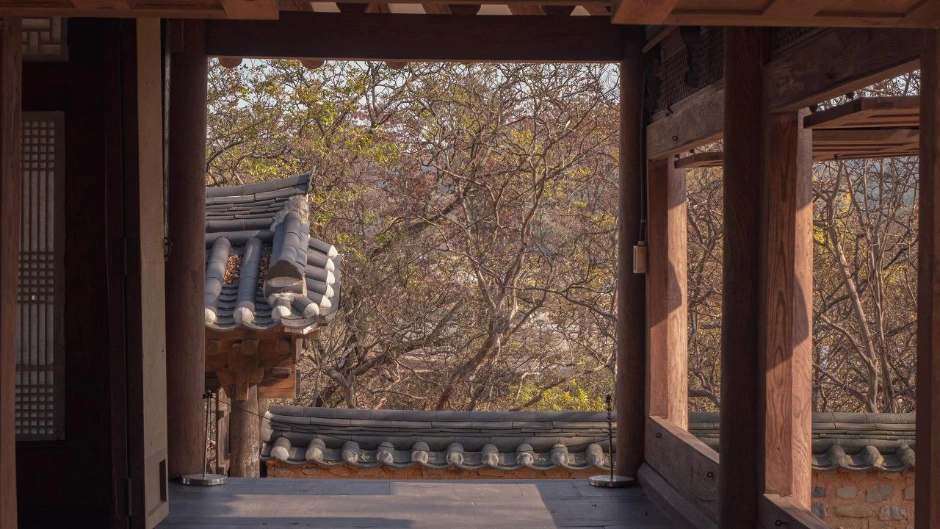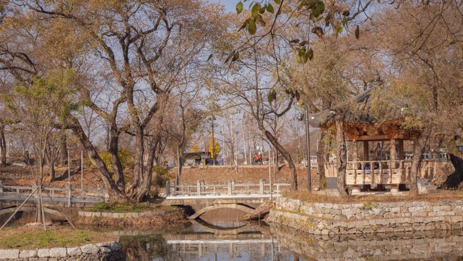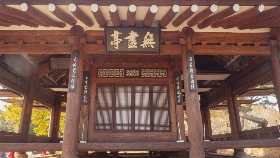다음으로 찾은 장소는 '무진정'입니다. 경상남도 유형문화재 제158호로 지정된 곳으로 조선시대의 문신이었던 '조삼'이라는 사람을 기리기 위해 후손들이 그의 거처에 정자를 짓고 그의 호를 따 '무진정'이라고 지었다고 합니다. 차를 대고 들어서자마자 연못 중간에 있는 자그마한 정자가 보입니다. 작은 정자는 최근에 새로 지은 것으로 보였어요. 정자 처마에 비치는 연못의 물결이 예뻤어요. 반대편 길로 걸어가면 진짜 무진정이 나옵니다. 고즈넉한 한옥 사이로 물든 나무가 마음을 차분하게 해 줍니다. 잠시 카메라를 내려놓고 경치를 감상했습니다.