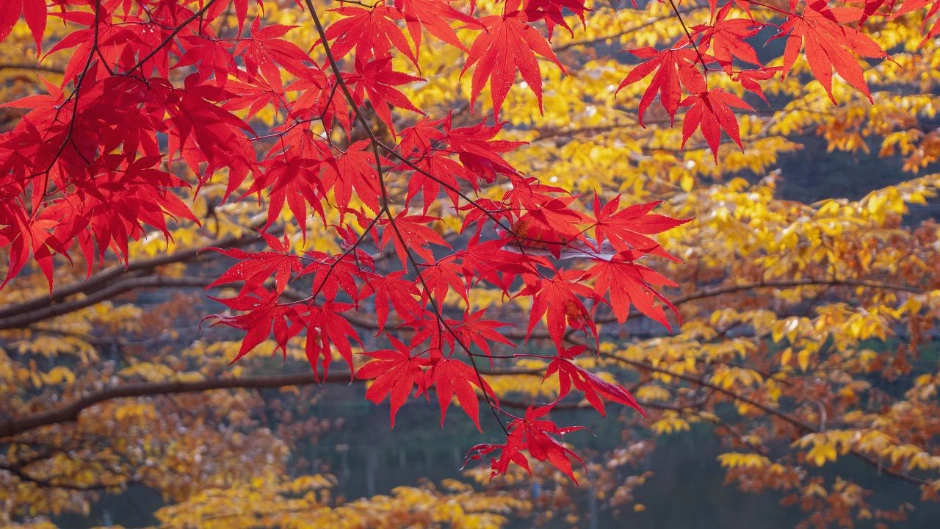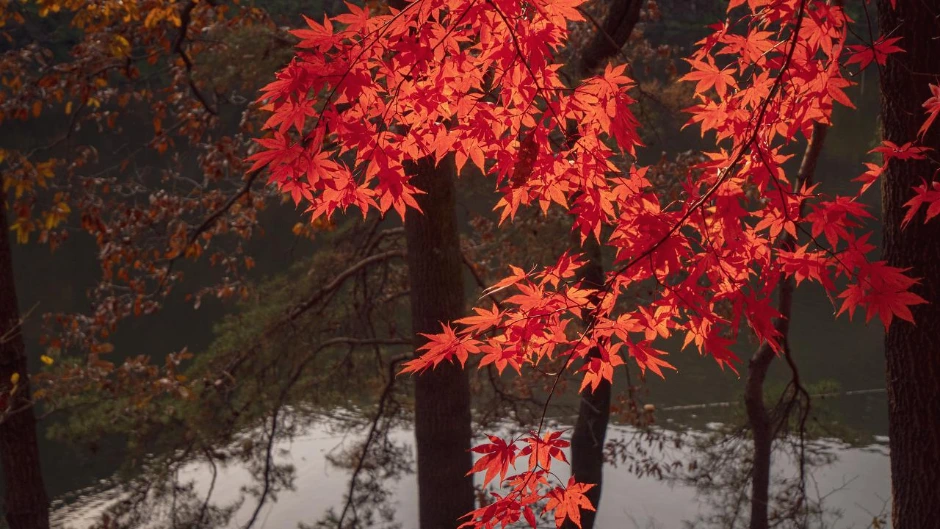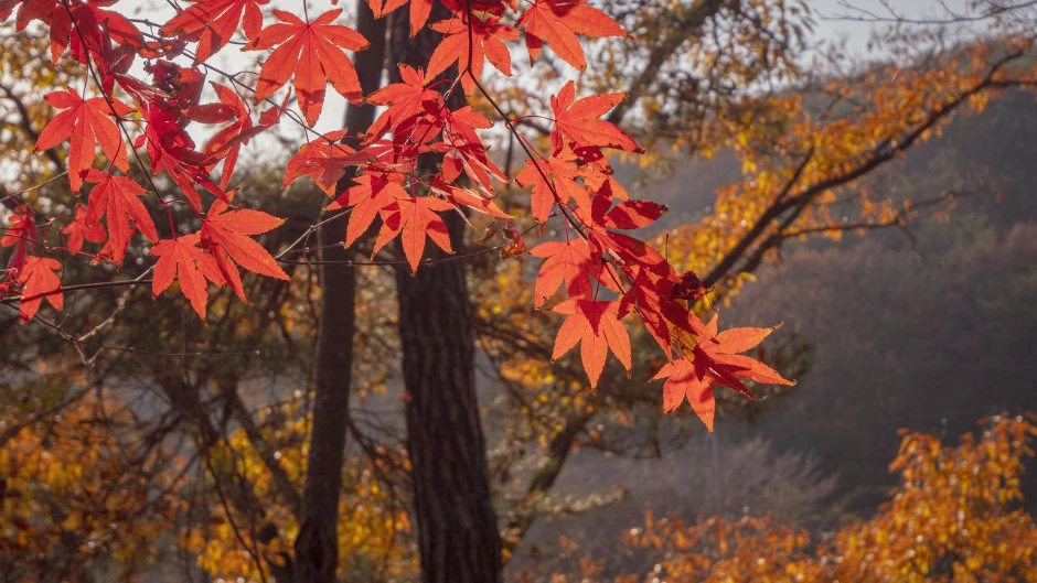 함안 여행의 마지막 장소는 '입곡 군립공원'입니다. 함안향교가 노란 은행나무의 천국이라면, 입곡 군립공원은 빨간 단풍나무의 천국이라고 해야 할까요. 단풍나무로 뒤덮인 산책로가 특징인 공원입니다. 규모가 꽤 큰 편이고, 찾는 사람들이 많은 것도 함안향교와는 비교가 되는 점이었어요. 저수지를 낀 산책로를 걸으며 단풍 사진을 찍는 사람들 사이로 저도 곧 저물어갈 마지막 가을을 눈에 담아봅니다. 나무들마다 물든 농도가 다르고 크기도 달라서 계속 걸음을 멈추게 되는 매력이 있는 곳이에요.