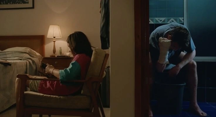 그리고 이 색상의 대비를 가장 극명하게 보여주는 장면이 한 번 등장합니다. 개인적으로 영화에서 가장 슬프면서도 중요한 장면이라고 생각하는데요, 캘럼은 호텔의 화장실에 앉아서 팔의 깁스를 풀기 위해서 남은 한 손에 가위를 든 채 끙끙대고 있고, 하나의 벽을 두고 거실 소파에 앉은 소피는 11살이 읽기에는 조금 수위가 있는 잡지를 읽고 있습니다. 소피가 있는 거실 공간의 조명은 노란빛이고, 캘럼이 있는 화장실의 조명은 푸른빛입니다. 두 사람은 이런저런 대화를 하고 있지만, 실제로 소통을 하고 있지는 않습니다. 거실과 화장실 사이에 있는 ‘벽’이라는 공간이 화면의 중간을 가로막고 있는 것처럼, 소통이 막혀있는 것이지요. 아버지 몰래 흥미로운 잡지를 읽는 것이 그저 즐거운 소피는 노란 조명 아래에서 아버지의 공간을 등 뒤로 한 채, 깁스를 자르려다가 실수로 본인의 팔에 상처를 냈지만 그것을 굳이 소피에게 알리고 싶지 않은(어쩌면 알아줬으면 하는), 파란 조명 아래의 캘럼을 외면하고 있는 것입니다. 그리고 영화의 대부분의 장면들은 - 앞서 계속 언급했듯 - 현재 시점 소피의 상상의 산물입니다. 11살의 아이가 부모의 마음을 모른다고 해서 어느 누가 그것을 탓할 수 있을까 싶지만, 어느새 당시의 아버지 나이가 된 소피에게는 그 순간들이 모두 붙잡고 싶은 안타까운 순간들일 것입니다. 캘럼의 그늘을 알아주지 못했던 스스로를 탓함으로써, 그렇게라도 아버지를 이해하고 싶고 그리워하고 싶은 심정일 것입니다.