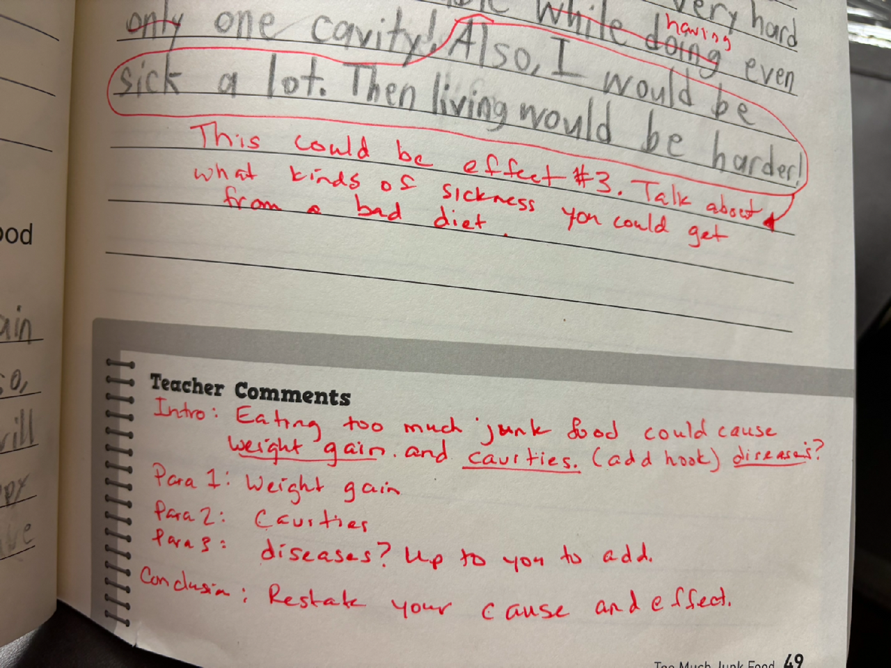 채니가 First Draft 때 정크푸드의 Effect를 2가지를 쓰고 어설프게 한 문장을 붙여 애매하게 마무리를 해서, 선생님이 Intro를 쓰고, Effect를 세 개로 단락을 나눠 명확하게 쓴 후 결론을 내라고 코멘트를 주셨다.