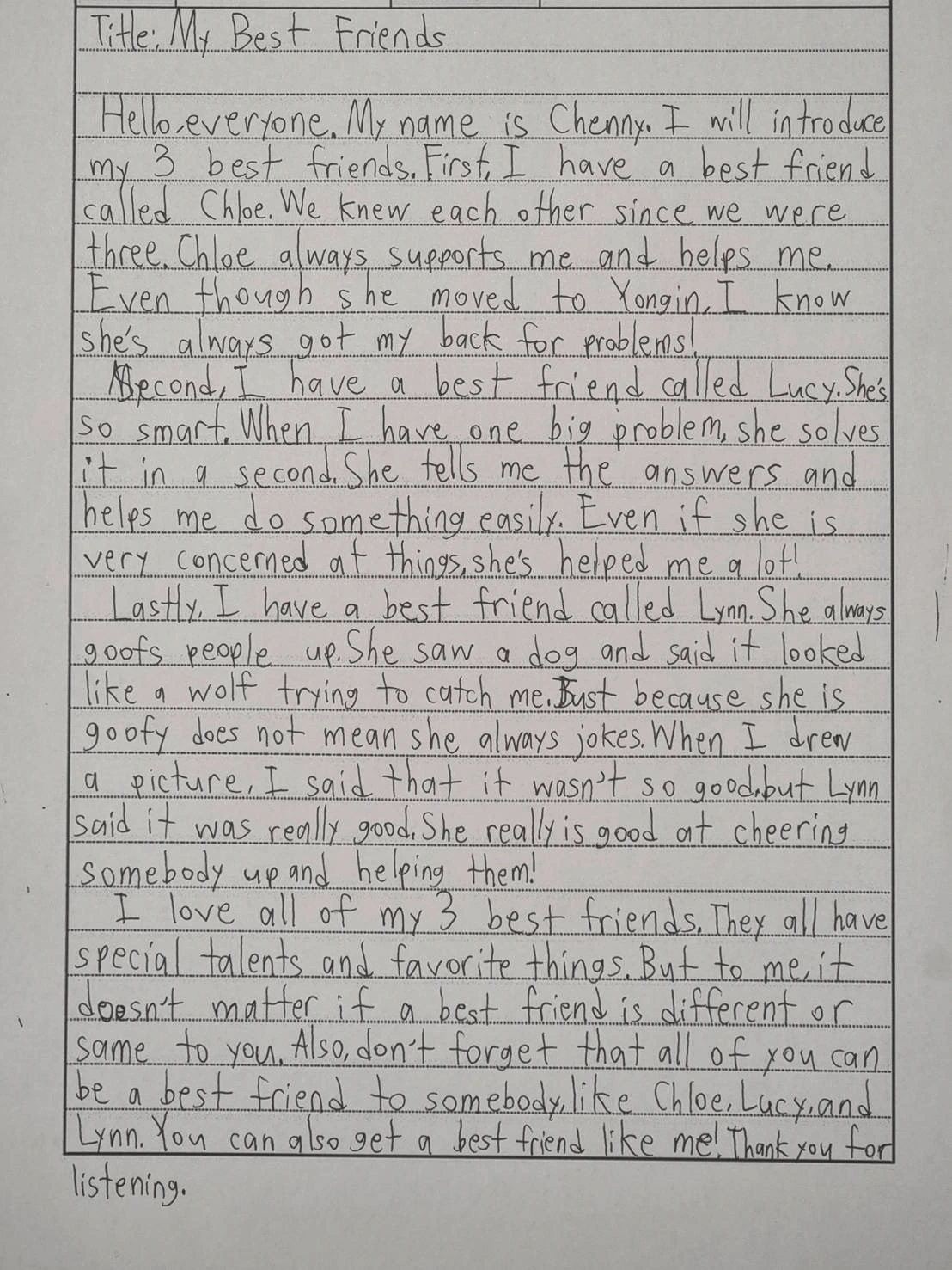 이렇게 얘기해 주는데 채니가 집중할 때 그 눈빛이 보였다. 선생님의 코멘트를, 엄마의 설명을 아주 초롱초롱한 눈빛으로 듣고 있었다. 그러더니 갑자기 종이를 가져와 Title을 썼다. My Best Friends라고. 너무나도 즐거운 표정으로 글을 쓰고는 "엄마 이거 읽어봐!" 하고 종이를 내밀었다.