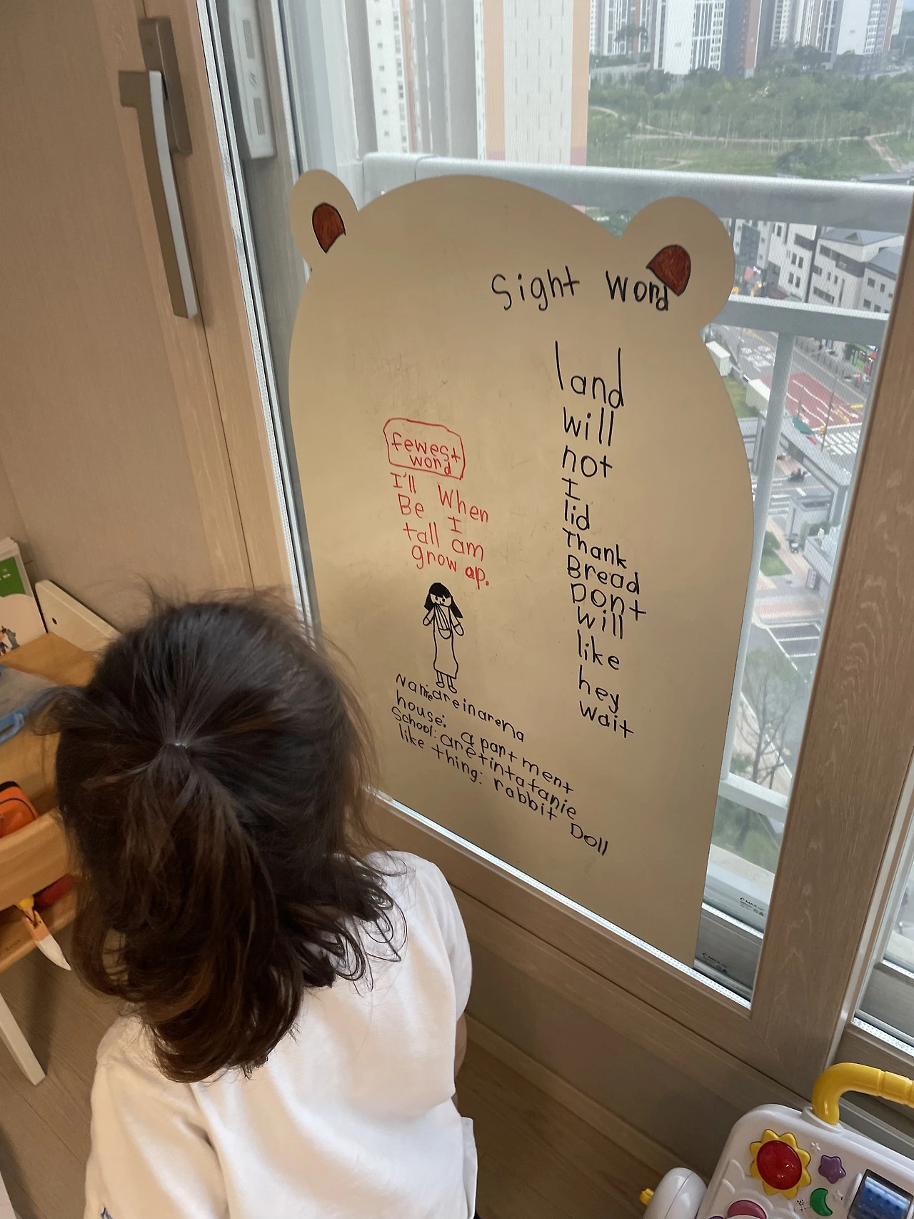 내가 더욱 마음을 놓을 수 있었던 더 큰 이유는, 아이가 영어를 대하는 태도 때문이었다. 영유에 입학한 후, 아이는 틈만 나면 집에서 영어를 끄적이기 시작했다. 원에서 배운 내용을 자발적으로 적어보기도 하고, 엄마를 강제 수강생으로 앉혀놓고 선생님 놀이를 하기도 했다. 원에서 선생님이 하시는 말씀을 그대로 흉내 내는 것 같았다. 그 자체로 아주 훌륭한 복습이었다.