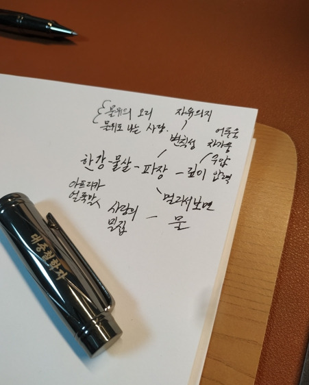 그는 해석을 더했다. “음. 마치 사거리 교차로에 밀집한 사람들이 오고 가는 모습과 같네” “그렇지. 같은 강안에서도 깊이와 속도가 다른 것처럼” 나도 받아쳤다.