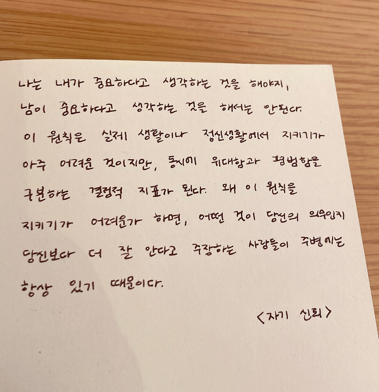 남의 성공에 배 아파 하지 않고, 그렇다고 해서 내 인생에 요행을 바라지 않으며 진정으로 다른 사람에 대한 칭찬에 인색하지 않은 사람이 되고 싶다.