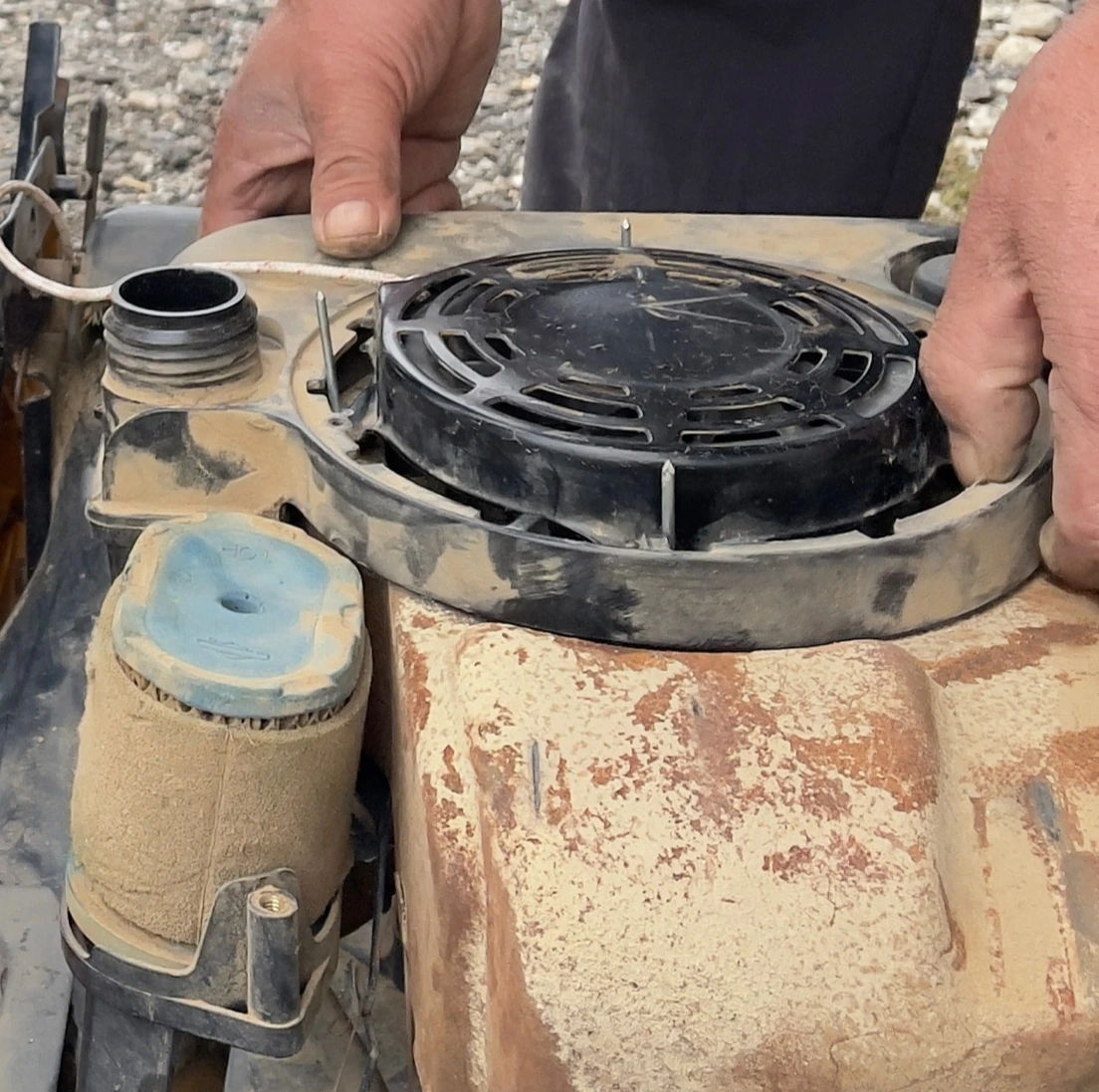 당기기는 당겼는데 시동이 안 걸렸다. 남편이 얼굴이 벌게지도록 여러 번 줄을 당겼다. 그런데 역시 안 걸렸다. 너무나 기운이 빠져 주저앉고 싶은 순간 구동 손잡이를 안 잡았다는 사실을 깨달았다. 구동 손잡이를 잡고 시동 줄을 당겨야 하며 손잡이를 놓으면 엔진이 멈춘다는 사실을 잠깐 잊어버리고 있었던 것이다.