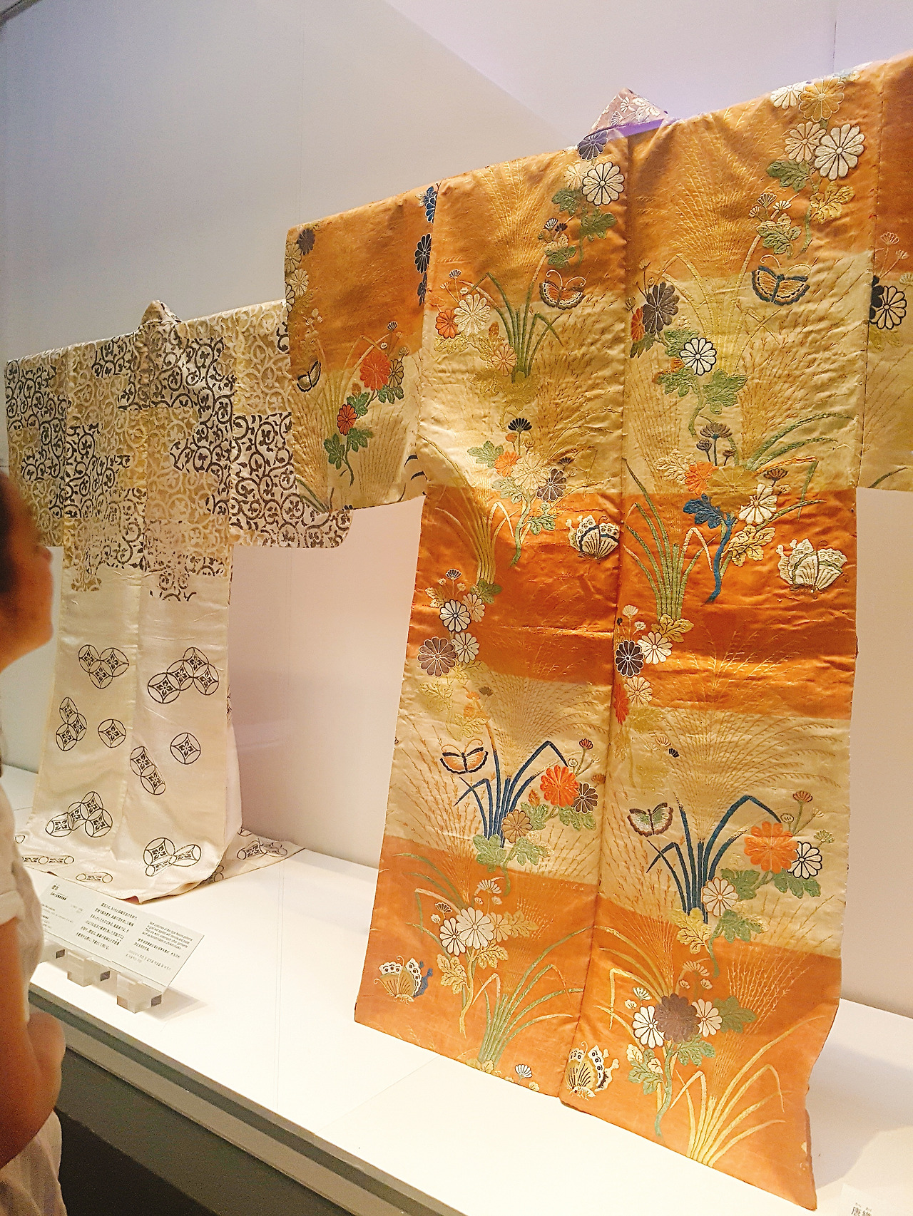 옷에 이 정도의 노력과 돈을 쏟아 넣어서 화려함을 만들어냈음을 가장 잘 보여주는 기모노가 인상 깊었어요. 상류층이긴 하지만 '옷'에 이 정도의 노력을 쏟아부을 수 있는 시기라는 거니까요.