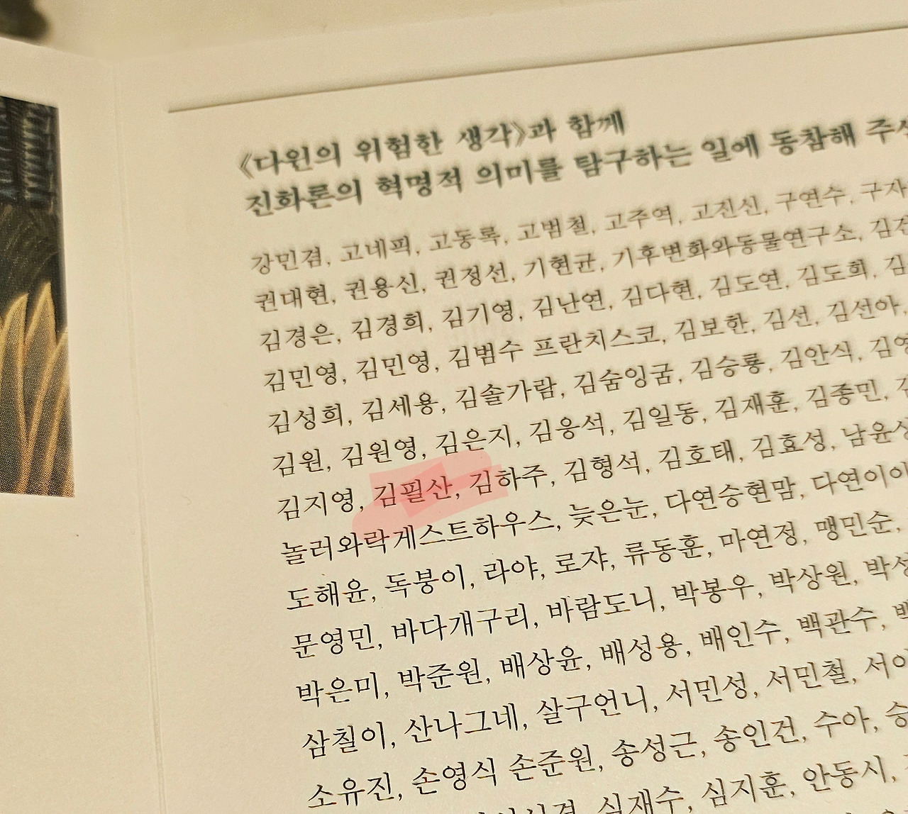 『Darwin's Dangerous Idea』도 너무 많이 보여서 외워버릴 지경인 제목이었다. 이 책이 바로 데닛의 책 중 마지막까지 번역되지 않고 있던 마지막 책이었을 것이다. 새삼 다윈의 진화론에 대해 알고 있을지라도 그 제목 자체로 전율이 인다. 책의 내용에 대해 궁금하기 이를 데 없는 대단히 도발적인 제목이다. 2025년 지금, 데닛 책을 여러 권 번역한 바 있는 바다출판사에서 북펀딩을 통해 이 책의 번역을 기획하였고 드디어 『다윈의 위험한 생각』이라는 제목으로 한국어 번역 출판되었다. 나 또한 펀딩에 참여해서 이름 석자를 이렇게 출판물에 남기게 되었다.