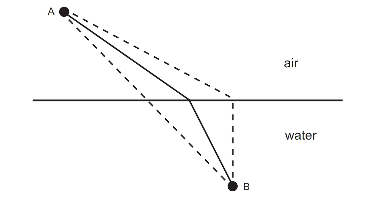 물론 내가 지금 말하고 싶은 것도 까딱했다가는 보-링한 물리 이론 설명이 될 가능성이 농후하지만, 그걸 넘어서 이 글이 원작자 테드 창의 소설 해제 비스무리한 것같이 보이고 싶긴 하다. 내가 요새 SF글쓰기 강의를 듣는데 SF소설가이신 강사님께서도 SF 중간에 갑자기 튀어나오는 물리학 강의는 어쩔 수 없이 들어가야만 할 필요악이고, 독자는 그냥 자연스레 아 그렇구나...하하하...그래서 다음 이야기는? 하면서 넘어가도 된다고 말씀하시더라. 테드 창의 소설에도 사실 그 장면이 있는데, 심지어 물리학자 이언(소설에서는 게리라는 이름)이 루이스한테 그림을 그려주면서까지 설명하는 부분이다. 그림은 구글에 '페르마의 원리'로 검색하면 나오는 누구나 다 아는 빛의 굴절 그림인데, 물론 누구나 다 아는 사실이겠지만 '페르마'는 여백 부족 드립의 그 페르마가 맞다.