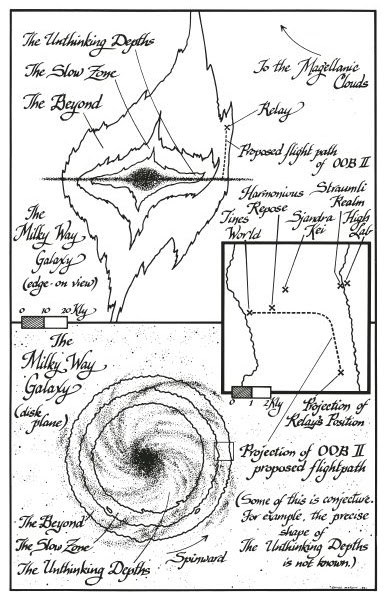 이 은하계는 실제로는 네 개의 권역(zone)으로 나뉘어 있다. 네 권역의 물리학 법칙은 각기 다르게 동작하는데, 대표적으로 속도의 제한이 있다. 은하계 외곽 권역으로 나갈 수록 빛과 물질이 빛의 속도 상수 (c=299 792 458 m/s) 를 초과하는 것이 가능하고, 세 번째의 권역인 '역외권(The Beyond)'에서는 대략 1광년(빛이 1년 동안 갈 수 있는. 은하계 지름이 10만 광년이라고 알려져 있으니 대충의 스케일을 이와 비교해 보면 좋을 것)의 거리를 한두 시간 내에 돌파하는 게 가능하다. 그러나 이 속도 제한 해제는 역외권과 그보다 더 바깥 권역인 '초월계'에서만 가능한 일이다. 두 번째 권역인 '저속권(The Slow Zone)'은 빛의 속도 상수가 속도의 제한이 되는, 우리가 익히 알고 있는 물리학 법칙에 의해 돌아간다. 인류는 아주 오래 전 저속권에 속한 지구에서 가까스로 탈출해 역외권에 가까웠던 '뇨라'라는 행성에 도달한 후에, 드디어 역외권으로 진입해 은하계 문명 네트워크에 합류했다. (인류가 쓰는 언어가 '삼노르스크어'라는 걸로 보아, 뇨라 쪽으로 탈출한 인류는 아마도 북유럽 계통일 듯.) 이 시점에 이미 지구와 뇨라는 역사 속의 장소이다.