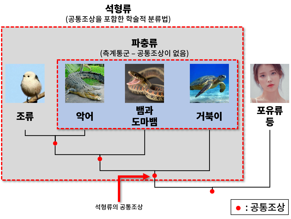 문제는 이 사우롭시드에서 우리가 파충류로 부르지 않는 조류가 후손으로 갈라져 나왔다는 것이다. 이젠 "조류는 공룡의 후손이며, 사실상 새가 곧 공룡이다"라는 얘기는 꽤 유명해졌지만, 아무리 그래도 새를 파충류라고 하지는 않는다. 새를 배제한 '파충류'라는 분류는 서로 가깝지 않은 세 집단을 묶어 놓은 것이라 이상하다. 왜냐하면 악어는 파충류가 아닌 조류와 가장 가까운 친척이고, 파충류 내에서는 어떤 종도 악어와 조류보다 가깝지 않기 때문이다. 그래서 분류학자들은 '파충류'라는 분류를 측계통군(paraphyletic group)이라고 부른다. 학술적으로는 아무래도 측계통군이 의미가 떨어질 수밖에 없다. 굳이 심하게 말하자면, '파충류는 존재하지 않는다.'