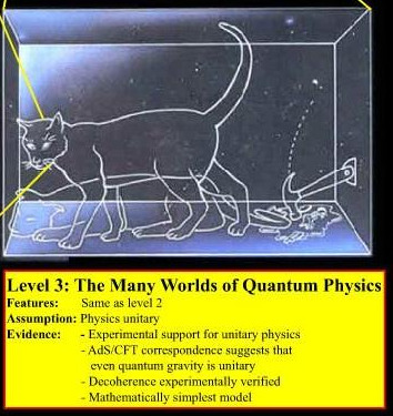 3단계 다중우주는 양자역학의 다세계 해석으로 도출된다. 슈뢰딩거의 고양이 사고실험에 대해 알고 있는가? 슈뢰딩거의 파동 방정식에서 파동이 ’관측을 통해 붕괴‘하듯이 삶 파동과 죽음 파동이 중첩되어 있던 고양이가 상자를 열자마자 둘 중 하나의 파동으로 급격하게 붕괴한다는 이야기 말이다. 그러나 물리학자 휴 에버렛 3세는 물리학이든 양자역학이든 뭐든 파동이 붕괴되는 것에 어떤 그럴 듯한 수식이 없음을 이상하게 여기고, 여기에 해석을 약간 변경한다. '파동함수는 절대로 붕괴하지 않는다'. 그렇게 되면 어떤 일이 일어날까? 고양이는 영원히 중첩된 상태로 존재할 것이다. 영원히.