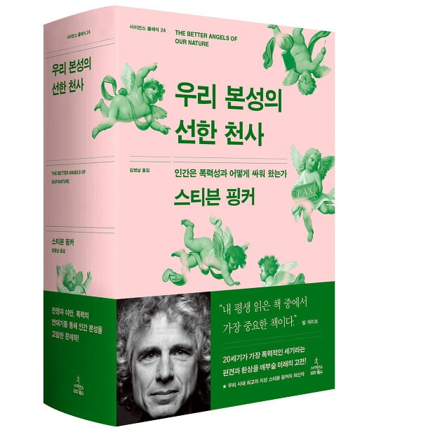 길게 쓰기로 소문난 심리학자 스티븐 핑커의 다섯 번째 책, 『우리 본성의 선한 천사』의 두께를 보자. 이 사람을 아는 사람들은 책을 보자마자 "어휴 이자식 또 이지랄이네"라고 자기도 모르게 한숨을 쉴 정도로 두꺼운데, 이 사람 책 중에서는 끝판왕 『빈 서판』보다 더 두꺼울 정도로 사상 최대를 자랑한다. 집이나 도서관에서 읽지 않고 지하철이나 대중교통을 이용하며 책을 읽는 사람들에게는 들고 다니느라 전완근에 크나큰 고통을 안겨줄 것이며, 아울러 핑크핑크한 겉표지와(아니, 왜 핑큰데? 혹시 스티븐 '핑커'라서?) 두께의 언밸런스함이 주위의 사람들에게 흥미와 관심을 불러일으킬 수 있는 바, 최대한 빨리 읽어버리는 게 정신적으로도 육체적으로도 이로울 수 있다.
