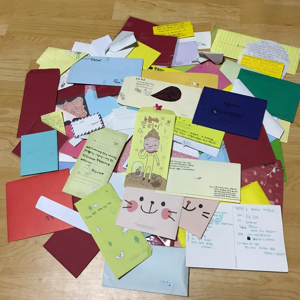 2008~2011 청소년 단체 봉사 활동, 2012 개인 활동 하면서 중고딩들과 가끔 대학생들이 준건데 제대로 전부를 읽어본건 이번이 처음인 것 같다. '이런게 보물 상자구나' 싶을 정도로 고맙고 감동적이었다. 무엇보다 힘을 엄청 많이 얻었다. 충격적인 건 약 20통 이상을 내가 직접 써오라고해서 받은 것;;