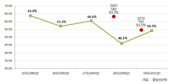 두 번째는 시민들의 정치 참여 부재에 있다. 위에서 말한 이유가 이들을 지치게 만들었다고 볼 수도 있다. 또 한편으로는 먹고사는 문제로 바빠서 다른 곳에 신경 쓸 여유가 없는 것일지도. 어쨌거나 대의제 안에서 누구나 가지고 있는 권리이자, 최소한의 의사 표현 방법인 선거를 우리는 어떻게 하고 있을까. 총선만을 보면 투표율은 아래와 같다. 2008년 18대 총선이 가장 낮았고 지난 19대 총선도 54.3%로 겨우 과반수를 넘겼을 분이다. 게다가 60세 이상의 투표율이 68.6%로 가장 높고, 20대 후반이 37.9%의 투표율로 가장 낮은 것으로 나타났다. 젊은 세대일수록 정치에 관심이 멀어진 것이다. 안타까운 현실이다.