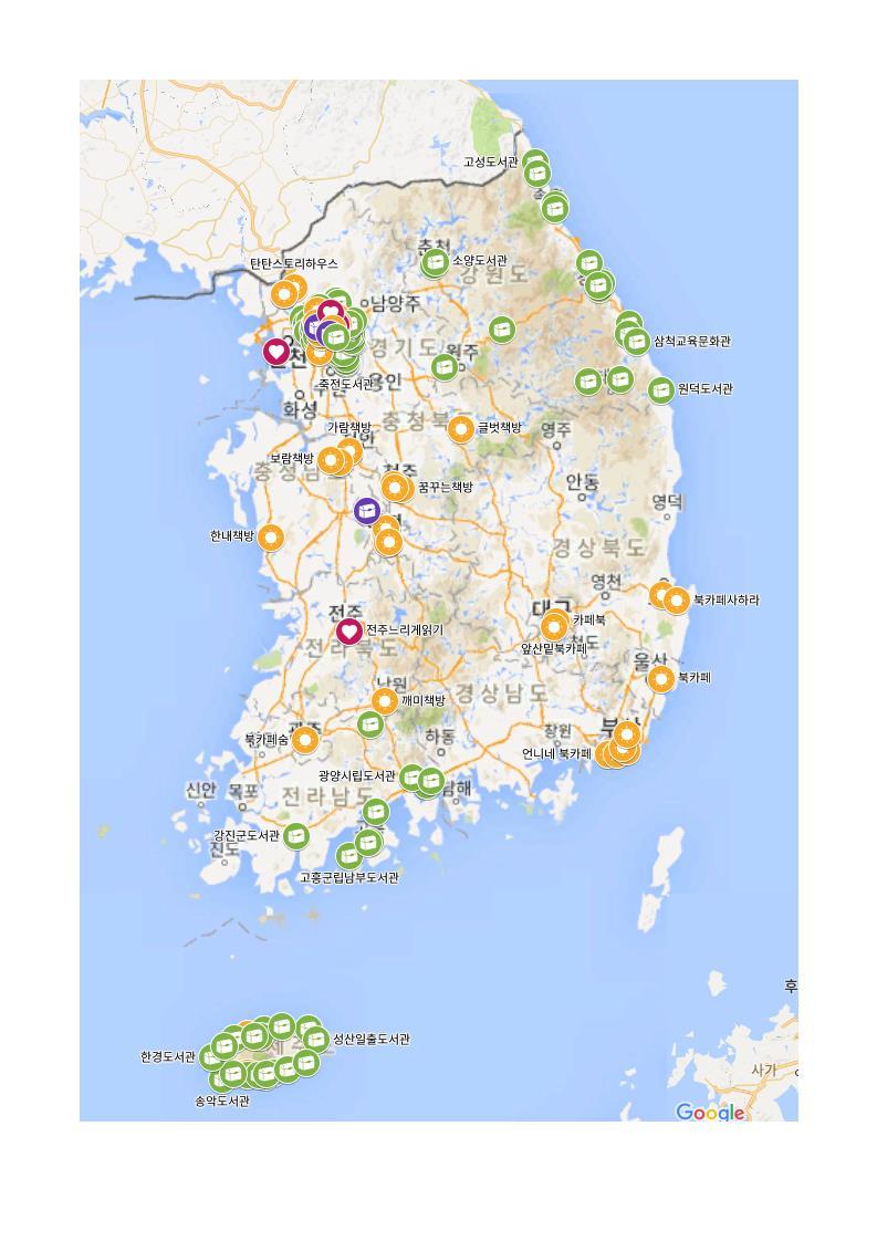 '책지도' 라는 것을 만들어 공유한지 열흘 쯤 지났네요. 구글지도 기능을 이용해서 지도를 만들고 있는데, 좀 더 편한 방법을 찾고 기능에 익숙해 지는 시간을 보냈어요. 현재 전국에 있는 책모임 7개, 공공도서관 229개, 책과 함께하는 공간 59개, 국립도서관 5개를 아래 지도에 표시해 놓았습니다.