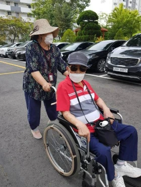 집으로 돌아오는 길, 엄마가 아빠의 휠체어를 밀겠다고 하신다. 원래 엄마가 혼자 따로 걸으면 온 동네 풀과 벌레들 참견하느라 계속 뒤처지시는데, 엄마가 휠체어를 미니까 느리지만 다 같이 걸을 수 있는 장점도 있다.