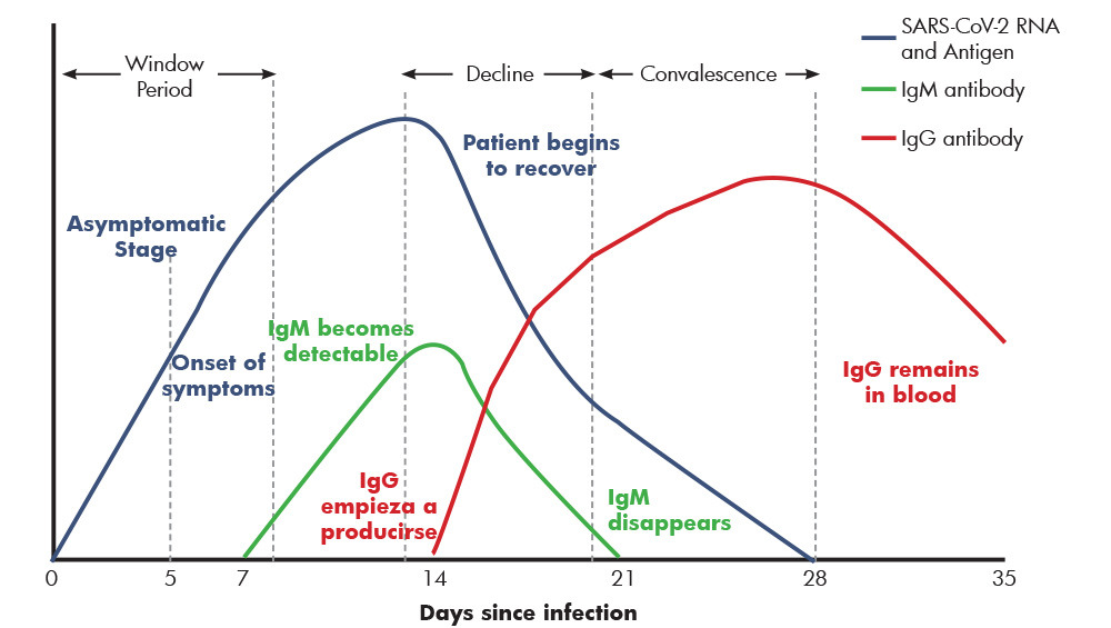 바이러스가 우리 몸에 들어오면, 보통 5-10일 정도면 중화항체가 몸에서 생성되고, 이것이 바이러스에 붙어 바이러스가 가진 전염력을 없앤다고 한다. 바이러스의 전파력은 1주일 이내에 peak를 찍고 감소한다고 하는데, 아래 그래프는 중화항체를 포함한 항체가 이제 생성되고, 이후에 계속해서 몸에 남게 되는 과정을 설명하고 있다.