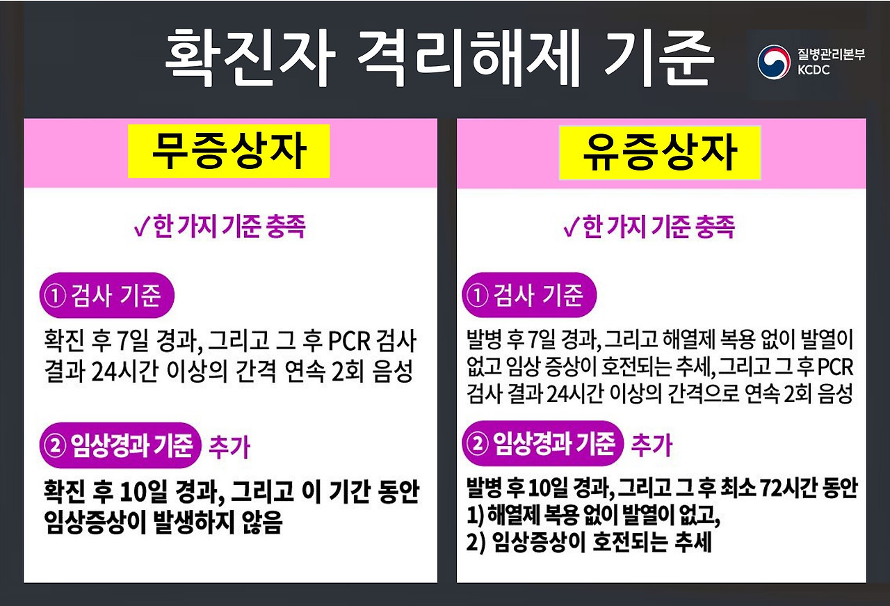 결론적으로 확진자의 경우, 증상 발현 후 9일 이후에는 바이러스 배양이 안된다는 것이 통계적 결과치라는 건데, 질병관리본부에서도 이를 받아들여 격리 해제의 기준으로 아래 표와 같이 임상경과 기준을 추가, 10일이라는 기간을 정한 것이다.