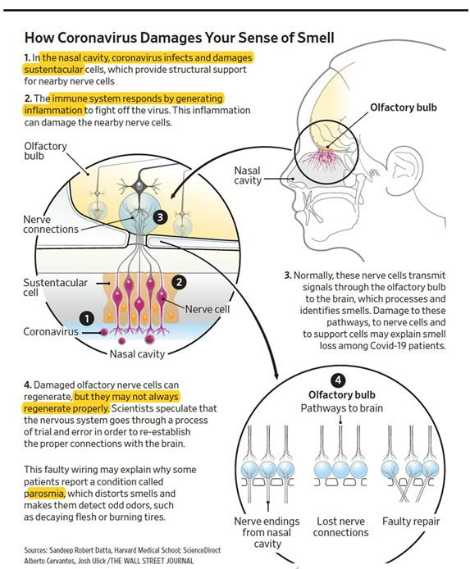 이는 하버드 의대 ‘샌딥 로버트 다타’ 연구팀이 밝혀낸 내용인데, 코로나바이러스가 감염되는 부위는 신경세포가 아니라 코 점막에 있는 후각 신경 지지 세포들이고, 전선을 감싸는 피복처럼 신경세포를 감싸고 있는 주변 세포가 손상되면서 신경 세포의 기능이 일시적으로 마비된다는 것이다. 연구팀은 후각 상실 증상이 심지어 호흡이 증상보다 더 일찍 발생하기도 한다며, 후각 마비는 코로나 19 감염 사실을 초기에 진단할 수 있고, 별다른 치료 없이 좋아진다는 점에서 오히려 의료진과 환자에게 도움이 된다고 했다.