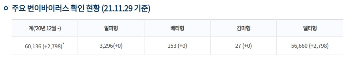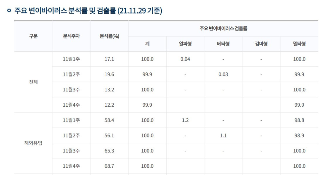 국내의 경우, 델타변이가 거의 대부분의 비중을 차지하는데, 11월 29일 기준 국내 코로나 확진자 중 델타 변이 감염 비중은 전체 확진자의 94%를 넘는다.(20년 12월 이후 누계 기준)