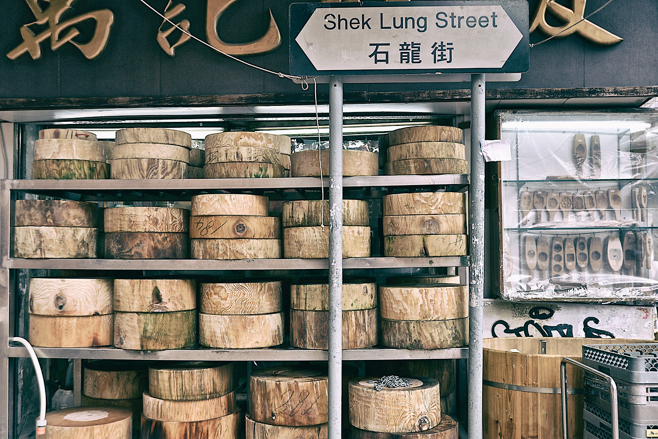 사진을 찍고 돌아서면 좁은 골목인 섹룽 스트릿 표지판 뒤로 통나무를 잘라 만든 도마 더미가 보이고 이제부터 나의 천국이 시작된다.