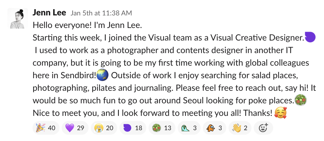 내가 자율적이고 주도적인 환경에서 더 의욕적으로 잘할 수 있는 사람이라는 것을 알게 되니 나를 존중해줄 수 있는 환경과 조직을 찾았다. 나에게는 내 작업뿐 아니라 회사 생활 전반에 있어 문제 상황, 어려움을 함께 살펴주고 조언을 주는 멘토가 필요했다. 그리고 내가 잘할 수 있는 것을 더 잘할 수 있도록 하는 도전적인 프로젝트 기회가 필요했다. 센드버드에서 나는 닮고 싶은 멘토를 만났고, 직무에서 느꼈던 갈증을 조금씩 해소해나가고 있다. 그리고 회사에서 만난 사람들, 그들과의 대화, 그리고 업무를 통해 나의 시야가 넓어지고 있음을 느낀다.