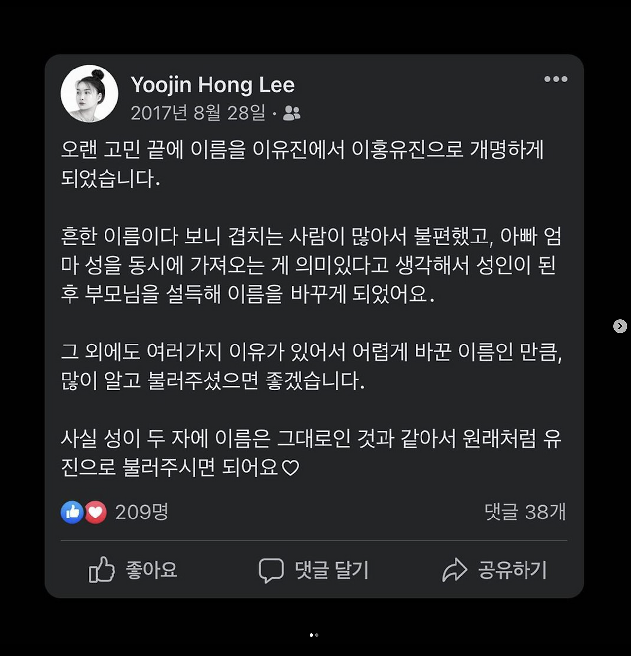 어쩌면 아주 오래전부터, 꽤 흔한 이름이었던 ‘이유진’이었을 때부터 나를 다른 사람들과 구별 짓고 싶어 했다. 미술을 선택한 것도 일반 과목에서는 표현하기 어려운 창의성, 고유함을 드러내고 구별되고 싶은 욕구 때문이었을지도 모른다. (그래서 그림을 공장처럼 찍어내게 만드는 입시미술을 싫어했다.) 성인이 될 때 까지도 어떤 이름으로 바꿀지 고민하다가 나중에 봐도 후회하지 않으리라는 다짐이 섰을 때 이름을 이홍유진으로 개명했다. 원래 이름에 엄마 성 ‘홍’을 더해 남녀가 평등한 권리를 갖는 삶, 그리고 구별되는 삶을 살겠다는 다짐이 있었던 것 같다.