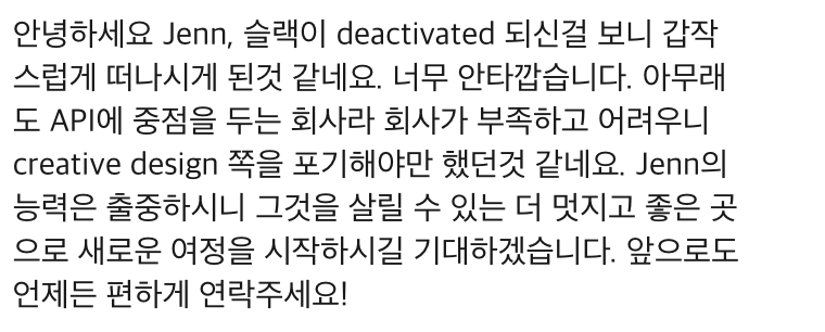 팀 메신저에 인사도 못하고 떠나게 됐는데 협업했던 분들과 연락이 닿으니 괜히 마음이 슬펐다. 하루 아침에 슬랙 알람도, 출근할 곳도, 하던 일도 없어져서 한동안은 마음이 허했던 것 같다. 정신없이 퇴사 절차를 밟고 포트폴리오와 외주 작업을 하면서 보내니 시간이 빠르게 흘렀다. 사람들을 만나면 분명 근무할 시간인데 나와있어서 휴가 낸 거냐고 물어오곤 했는데, 아직 마음의 준비가 안되었는지 입이 떨어지지 않을 때가 있었다. 어쩌다 솔직하게 얘기하면 괜히 분위기가 숙연해지기도 했다. 주변에 알릴 때 ‘이런 일이 있어서 퇴사했는데 금방 이직해서 지금은 더 좋아졌어’라고 하고 싶어서 급하게 다른 회사에 지원해보기도 했다. 그 회사 덕분에 포트폴리오도 업데이트하고 오랜만에 영어로 인터뷰 준비도 하면서 내가 해온 일들을 정리할 수 있었는데 아쉽게도 최종에서는 떨어졌다는 연락이 왔다. 나보다 더 연차 높고 디렉터의 역량을 가진 지원자를 뽑았다고 했는데 지난 3주간의 노력과 기다림이 아쉬워 그날 하루는 속이 쓰렸지만 며칠이 지난 지금 돌아보면 그 산업이, 팀이 나와 핏이 맞지 않았던 거라고 받아들였다. 그래도 처음으로 인터뷰에 참여했던 디자인 헤드에게 커피챗과 인터뷰 피드백을 요청해 배울 수 있는 기회를 얻기도 했다.