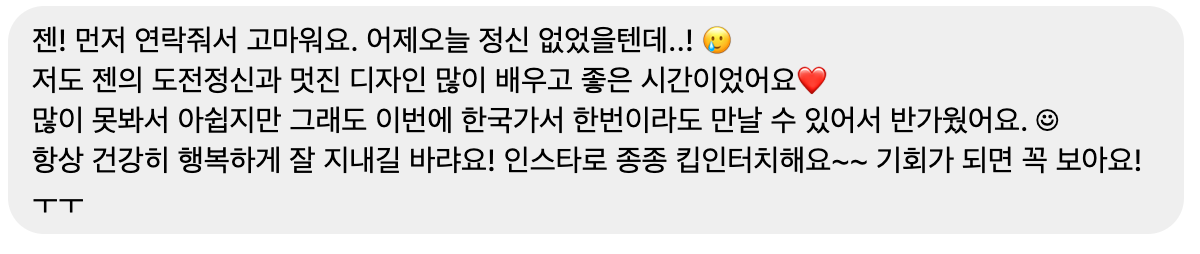 지난 시간을 돌아볼 때 센드버드는 나를 알아봐 준, 지금의 매니저와 팀원들을 만나게 해 준, 디자이너로써 더 멀리 꿈꾸고 성장할 수 있게 해 준 참 고마운 회사였다. 오피스에 마지막으로 가서 노트북을 정리하고 함께 일해왔던 매니저와 밥을 먹었다. 두고 온 물건이 없는지 사무실을 층마다 돌아보면서 눈가가 조금 촉촉해졌다.