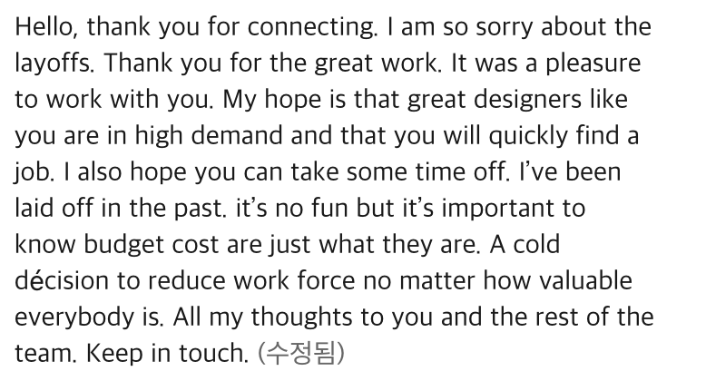 이미 뉴스로도 나왔으니. 살면서 한 번 쯤 겪을 수도 있고 아닐 수도 있는 레이오프 대상자가 되었고, 아마 내가 외국계 커리어를 이어간다면 언젠가는 또 겪을 수 있는 일이라 미리 경험하게 되었다고 생각하며 한 달이 지난 이제는 조금 덤덤해졌다.