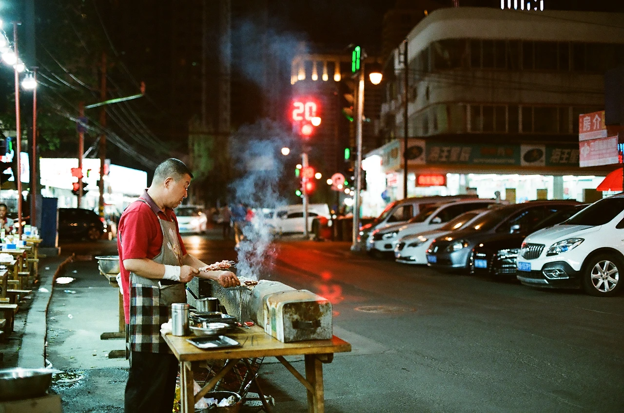 꼬치를 쉬지않고 굽고 있는 아저씨. 장인이라 부르고 싶다.