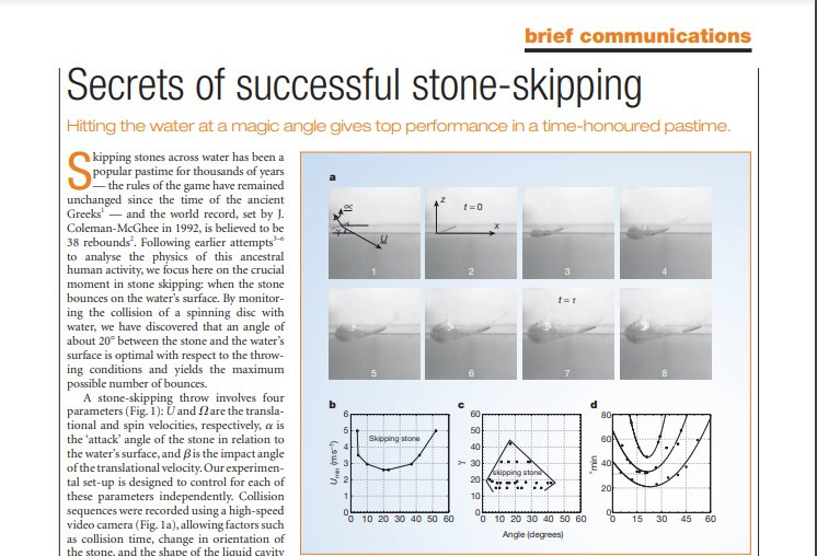 무려 네이처에 (네이처, 사이언스 등은 일반인들에게도 널리 알려져 있는 유명한 과학저널이다.) '성공적인 물수제비 뜨기의 비밀'이라는 제목의 논문이 발표되어 있었다.