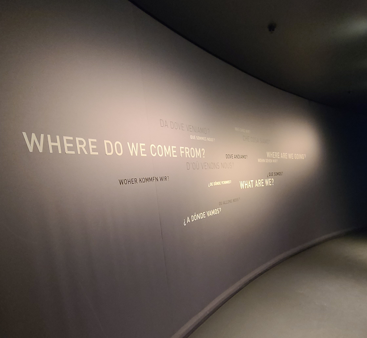 전시관에는 입구에서 바로 만나게 되는 벽에는, 다양한 나라의 언어로, 물리학자의 심장을 벌렁거리게 하는 말이 적혀 있었다. WHERE DO WE COME FROM? WHAT ARE WE? WHERE ARE WE GOING?