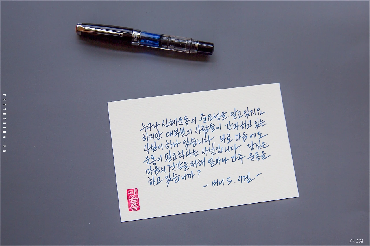 대만 브랜드, 다이아몬드 540 모델의 미니 사이즈 펜이다. 피스톤 필링 방식이라 잉크를 많이 넣을 수 있으며, 트위스트 캡이라 잉크마름 현상이 거의 없다. 무게 20g 미니 사이즈라 캡을 체결하여 필기한다. 대부분의 펜들은 캡을 끼우지 않고 사용한다. 가벼운 서걱임 속에 꽤나 부드럽게 미끄러지는 펄감을 보여준다. 음, 달군 프라이팬 위를 미끄러지는 '버터 필감'에 가까운 듯.