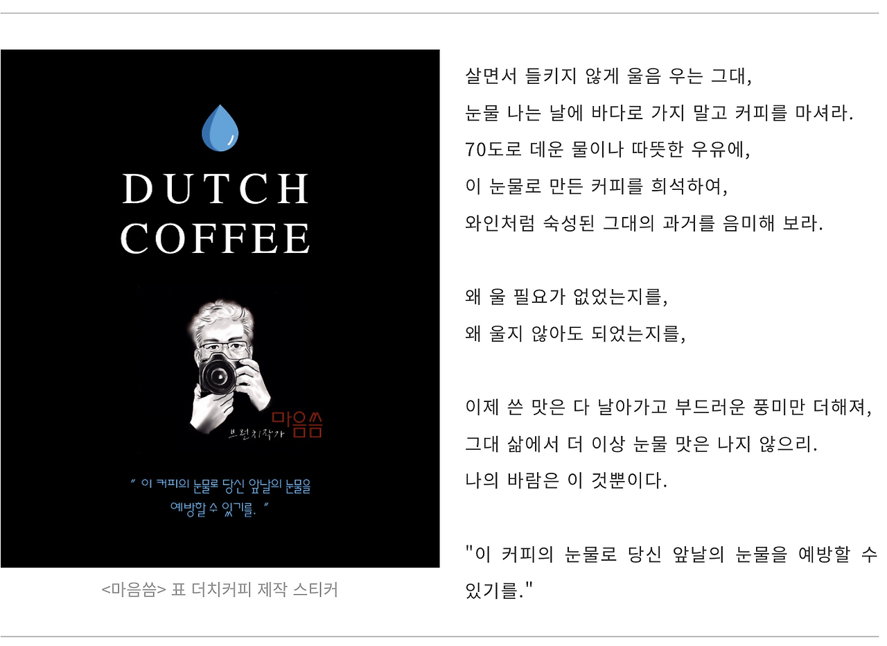 사진처럼 선명한 과거의 알갱이들이 복기하는 바둑알이 되어, 내 사무실 냉장고 안에서 콜드 브루(cold brew) 되고 있었다. 그동안 살았던 세월의 원두를 핸드드립 때보다 조금 더 곱게 갈아서, 반성의 찬물을 머리맡에 담아 두면 한 방울 한 방울, 살아오면서 흘렸던 눈물들이 차갑고 냉정하게 우려지게 되는 것이다. 300ml 유리병 가득 눈물이 채워지면, 딸이 그려준 캐리커쳐를 넣은 상표 스티커를 부착하고 딱 맞는 상자에 넣어 포장한다. 그러고 나서 아쉬운 듯 상자 안에 이런 쪽지를 적어 동봉하면 끝이다. 커피의 눈물을 모으는 일을 마치게 되는 것이다.