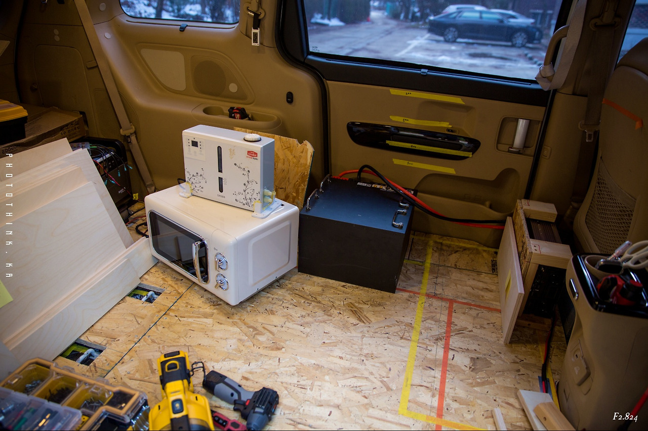 바닥을 데우는 방식을 보완하려 라디에이터를 설치했다. 자동차용 라디에이터를 알리에서 직구하여 조수석 시트 밑에 두었다. 제 임무를 다하고 복귀하는 난방수를 한번 더 돌려 공기를 데우고 가라고 붙잡은 것이다. 이러면 실내 공기가 조금이라도 더 빠르게 따뜻해지지 않을까 싶었다. 그리고 마지막으로 바닥에 마루를 깔았다. 3열(3인석) 싱킹시트가 펼쳐질 홈의 탈부착 마개도 재단하여 완성했다. 1인석 라인은 마루덮개로, 2인석은 멀바우 덮개로 만들었다. 별 차이는 없으나, 2인석 쪽만 펼치고 1인석 쪽은 항상 방바닥 상태로 있을 것을 전제했다.