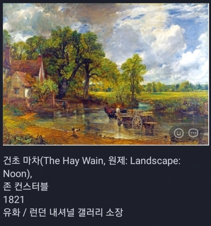 존 컨스터블은 태어나고 자란 영국 서포즈 지방의 스투어 강변의 고향 마을을 평생 아끼고 사랑했다고 한다. 부유한 곡물상인의 아들이었던 그는 고단한 노동과 가난에서 자유로웠을 것이다. 그렇다 하더라도, 누구나 자신이 태어나고 자란 마을을 이토록 따뜻하고 섬세하게 그리진 않았을 것이다. 해외로 그림 여행을 떠나는 대신 영국의 풍경, 자신이 머물고 있는 지역을 반복적으로 그리길 즐겼던 존 컨스터블에게는 날마다 새로운 풍경이 펼쳐졌을 것이다. 날씨와 구름에 대한 관찰은 많은 인내를 필요로 하였을 것이다.