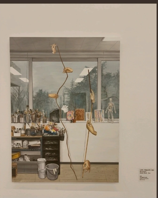 적당한 자기 검열은 있지만 뽀샵은 없는, 감정이 절재 되고 정도껏 사실적이다. 화가는 순간을 포착하여 지나온 시간과 앞으로의 날들을 가늠하고 있는 듯하다. 작업실이란, 작업을 하는 공간이다. 일상성에서 벗어나 몰두하는 곳이다. 작가 박완서는 저녁상을 물리고 밥 상을 펴놓고 원고를 썼다고 하고, 공지영 작가도 식탁 위에서 글을 썼고, 손원평 작가도 찌개 냄비를 밀어 두고 글을 썼다고 한다. 물론 유명해지기 전이었겠지만 열망이 현실을 뛰어넘은 것이다.