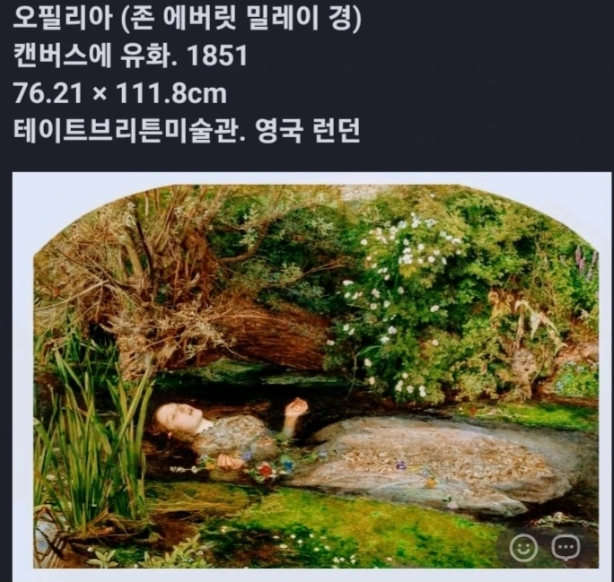 한 손에는 꽃다발을 쥐고 그녀는 강으로 떨어졌다. 흐린 눈은 오필리어를 다른 세상으로 이끌고, 벌려진 입술 사이에서는 노래가 흘러나온다. 그녀는 창백하고 아름답다. 죽음의 순간이 이토록 아름답지만은 않을 터인데, 이미 타자화된 그녀는 고통마저, 죽음마저 화려하게 전시된다. 죽음으로 그녀의 존재가 완성된 것인가.