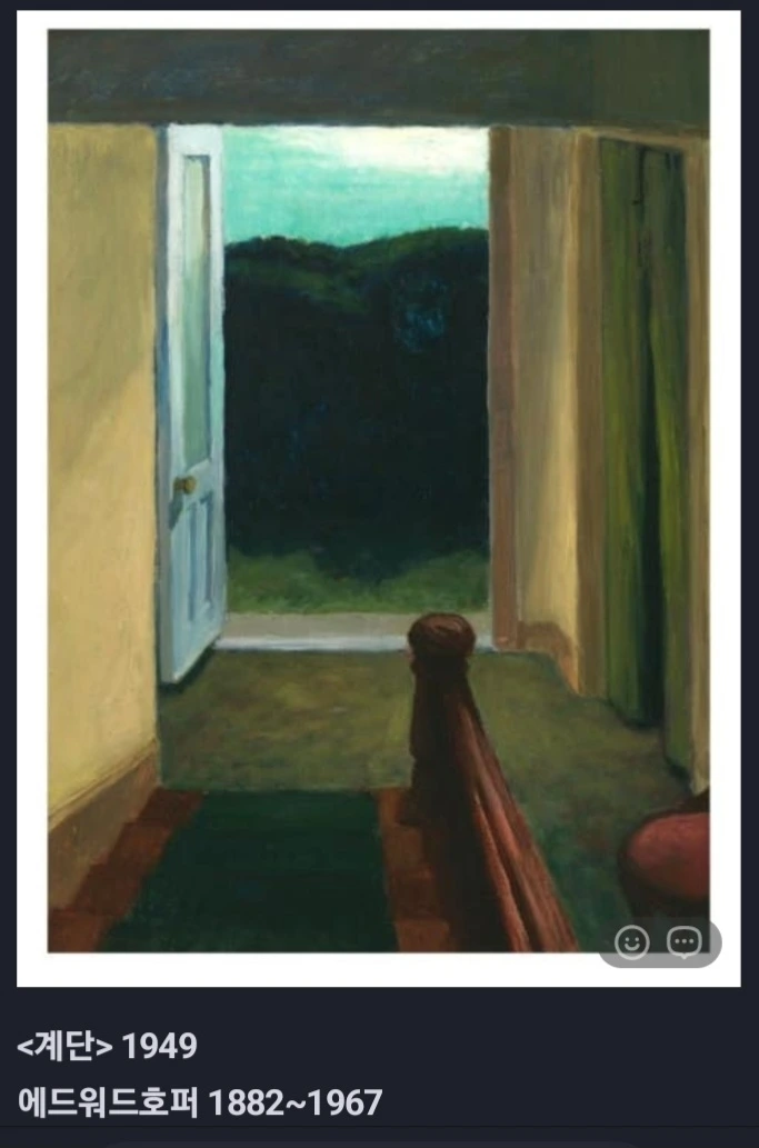 붉은 계단을 내려가 어디론가 떠나려고 하는 것일까. 어둠이 깊은 숲에서 돌아와 잠시 숨을 고르며 뒤 돌아보는 것일까, 그것도 아니면 그냥 붉은 계단 위에 앉아서 건너편 숲을 바라보고 있는 것일까. 검은 숲 너머에는 옅고 푸른 밝음이 있고, 그 뒤에는 흰 물결이 있다. 그것은 끝내는 품어야 할 소망일 것이다. 열린 문으로 여기와 저기는 연결된다.