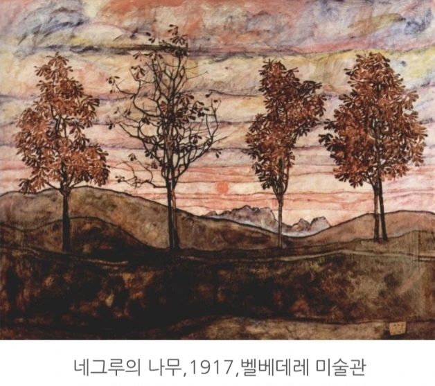 살갗을 파고드는 예리한 그림을 그렸던 에곤 쉴레의 그림 ‘네 그루의 나무’는 황량 하지만 따뜻한 기운이 감돈다. 1918년 스페인 독감으로 28세의 젊은 나이에 사망한 그가 좀 더 살았다면 그의 그림은 달라졌을지 모른다. 송곳 같은 그림도 어느 정도는 뭉근 해 졌을지 것이다. 결혼 후 곧바로 전쟁에 동원된 그는 그해 3월부터 9월 말까지 상세한 일기를 남겼다. 일기 마지막 페이지에 있던 6개의 작은 풍경 스케치는 ‘네 그루의 나무들’ 그림의 모티브가 되었다. 그림은 오스트리아 빈 남부의