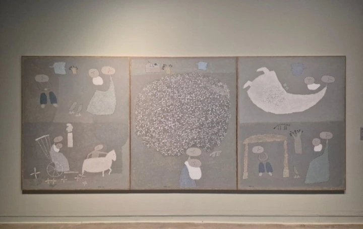 '백영수'의 그림 '모성의 나무'에는 다복한 이야기가 있다. 엄마는 흔들의자에 앉아 나직이 자장가를 부른다.