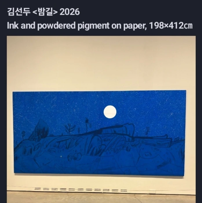 김 선두의 ‘밤길’은 칠흑 같은 밤이 아니다. 푸르고, 별도 빼곡하고 둥그런 구멍 같은 달이 하얗게 떠있는 어슴프레 어둡고, 희미하게 밝은
